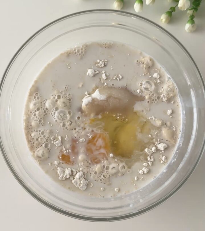 I cornetti con gocce di cioccolato sono molto semplici da preparare, per prima cosa mettete in una ciotola la farina, lo zucchero, il lievito di birra sciolto in un pochino di latte tiepido, preso dal totale, il latte rimasto, l’uovo, la vaniglia e impastate velocemente con una forchetta.