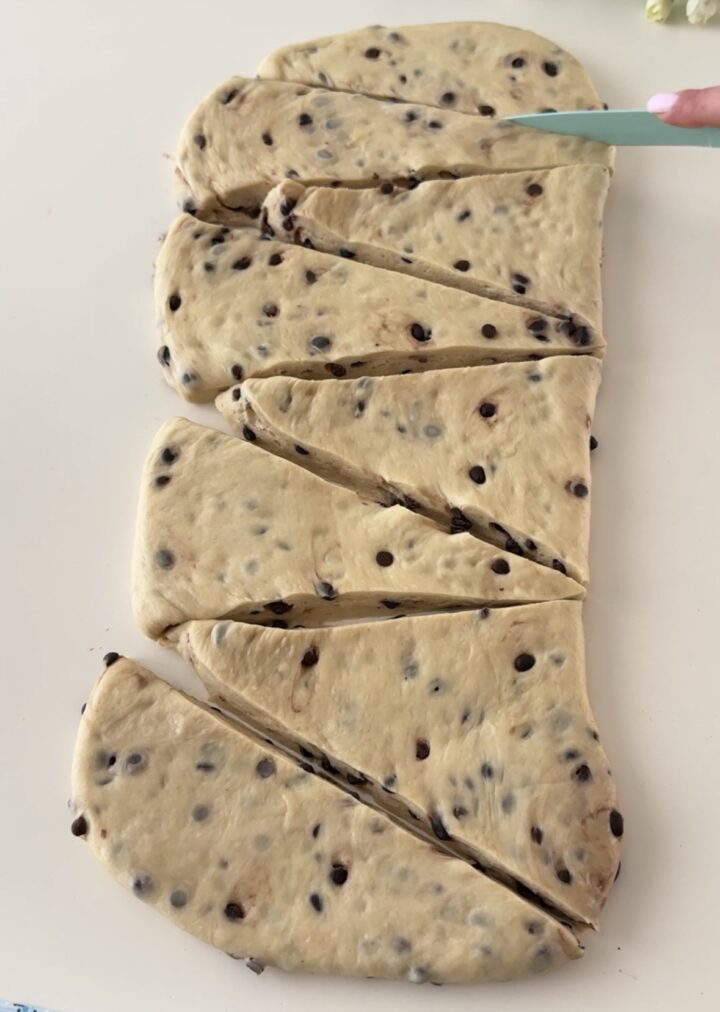 Allungate ciascun triangolino, tirando la punta, e arrotolatelo, formando un cornetto. Realizzate così tutti i cornetti con gocce di cioccolato e lasciateli lievitare per 30 minuti.