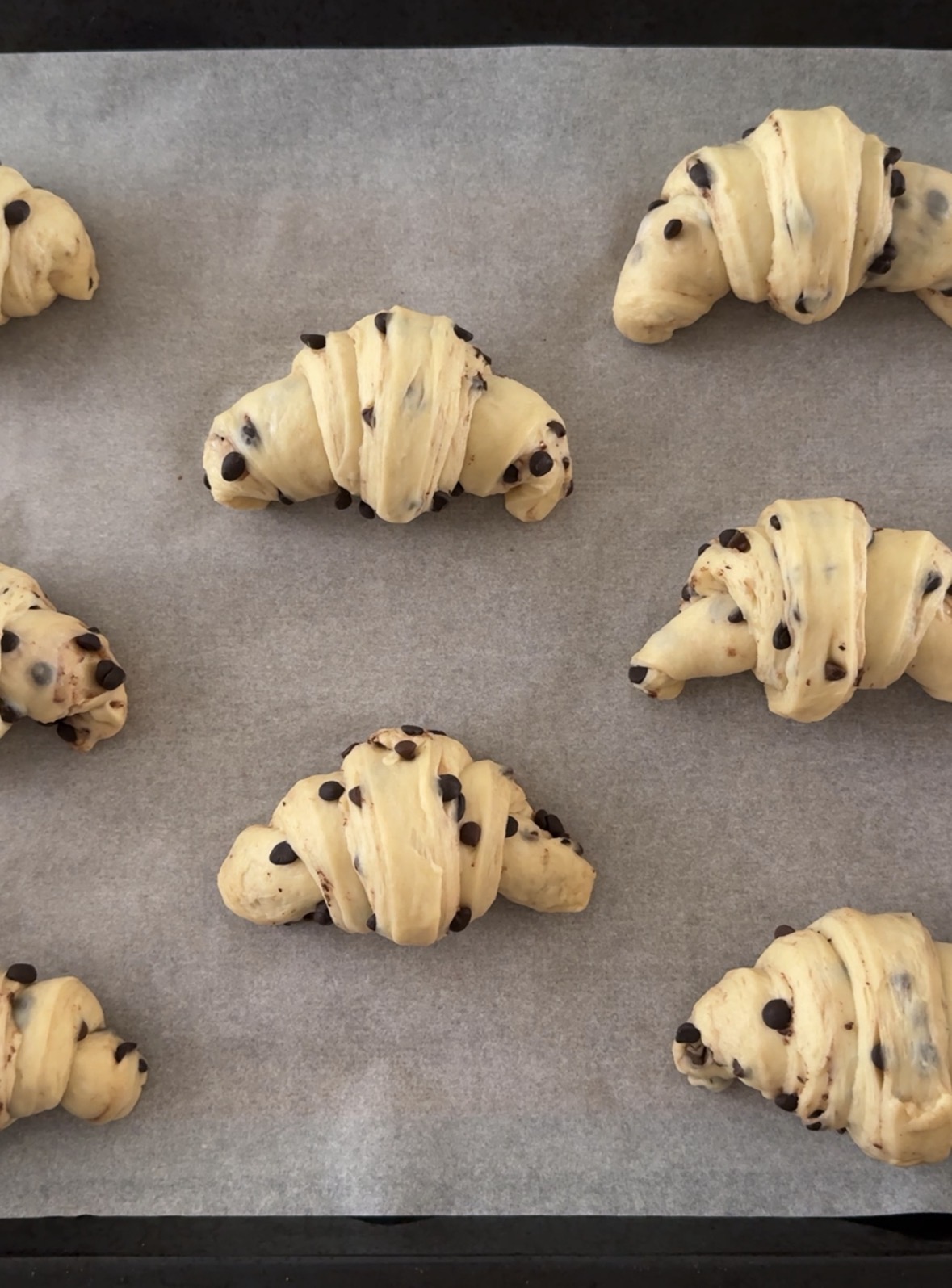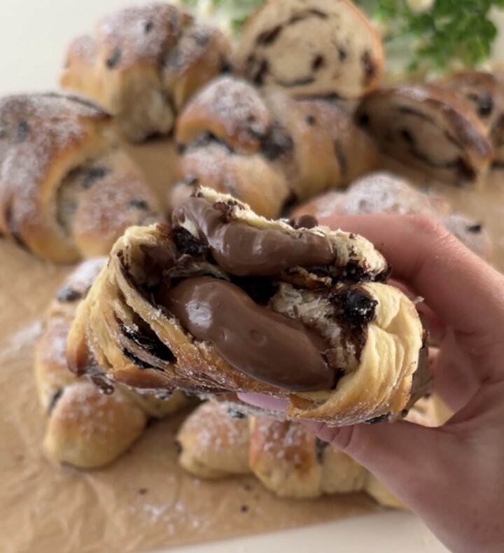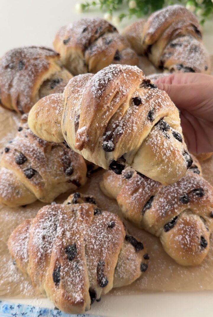 I cornetti con gocce di cioccolato sono pronti, buonissimi da soli e perfetti da farcire con il ripieno che preferite.