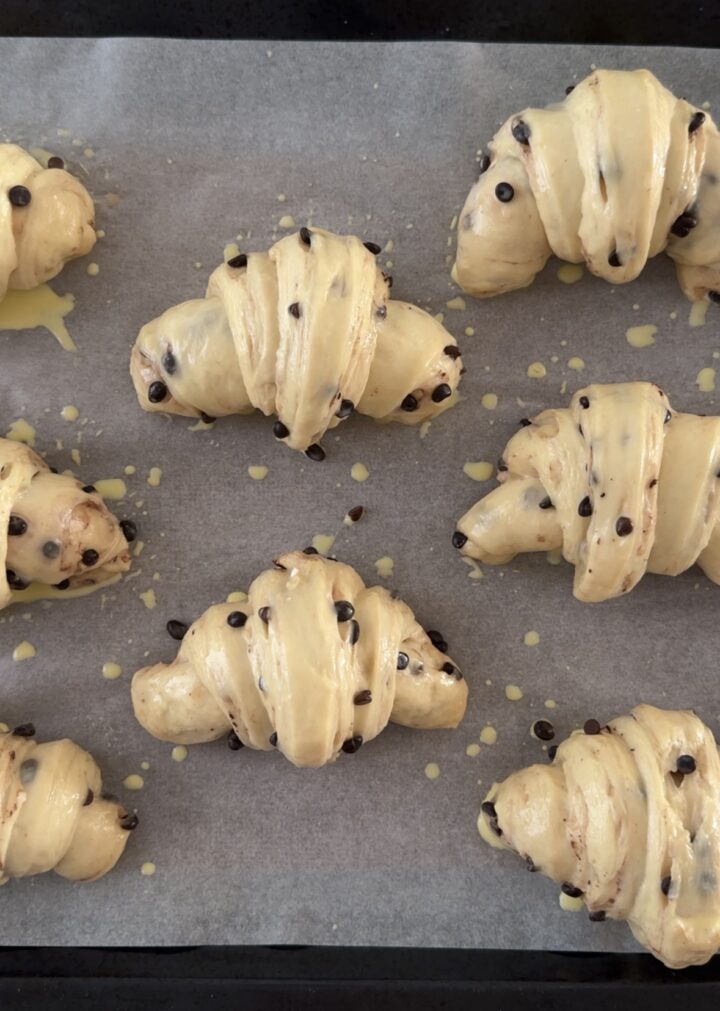 Spennellate i cornetti con gocce di cioccolato con il tuorlo sbattuto con un goccino di latte e cuoceteli in forno preriscaldato a 180 gradi per 30 minuti circa, devono risultare dorati.