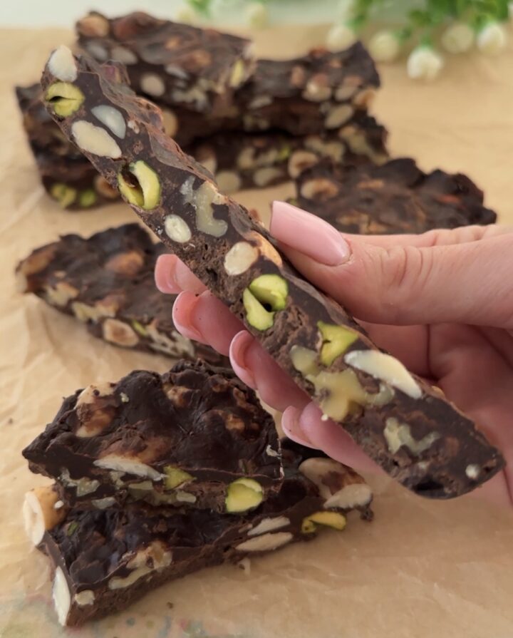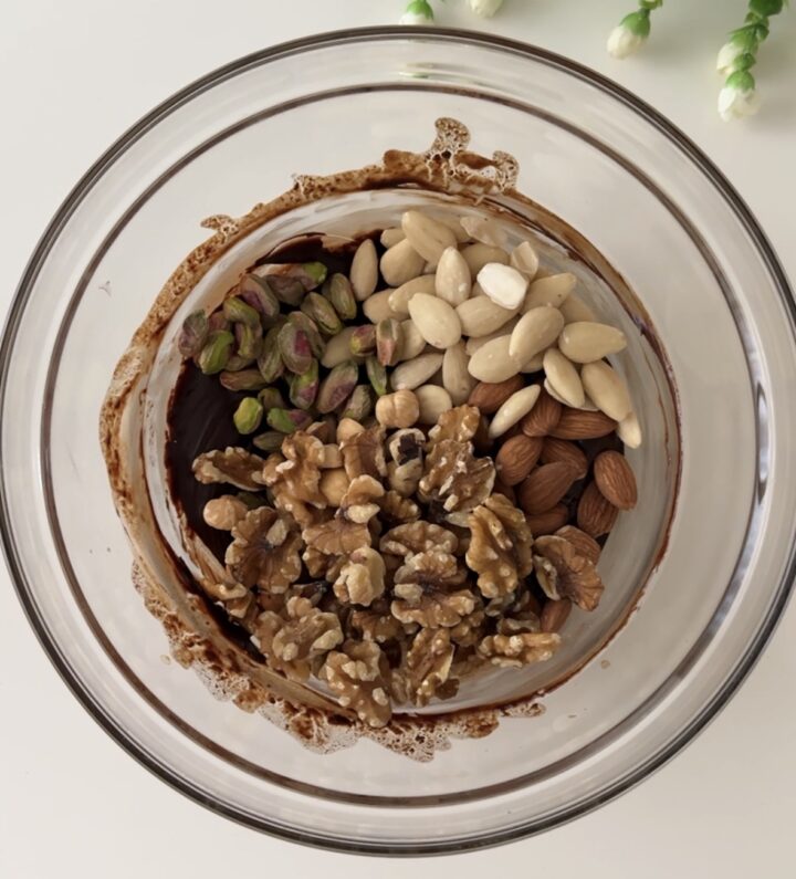 Unite il caffè ancora caldo al cioccolato e fate amalgamare per bene i due ingredienti, aggiungete poi la frutta secca che preferite, io ho messo mandorle pelate e non, pistacchi, nocciole e noci.