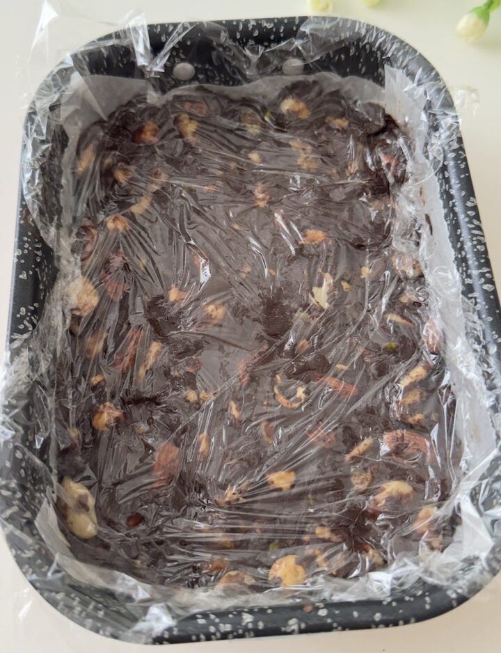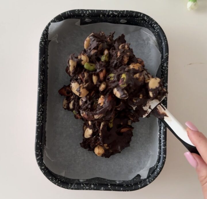 Fate amalgamare per bene il tutto e trasferite il composto in una teglia foderata con carta forno, livellatelo per bene, copritelo con della pellicola trasparente e schiacciate per compattarlo bene.