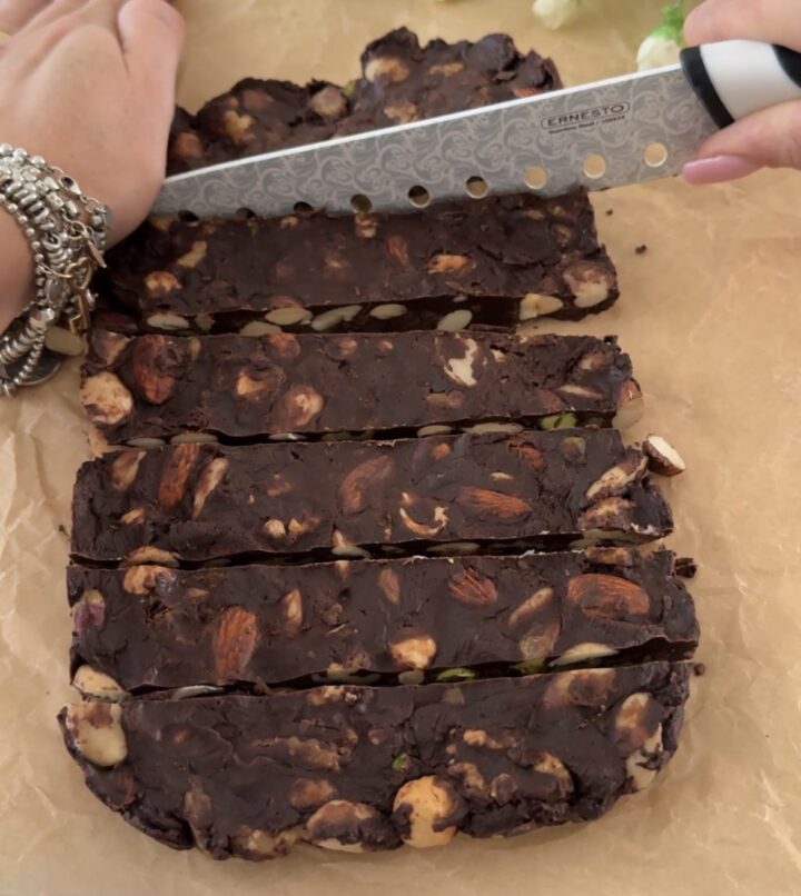 Lasciate riposare il croccante al caffè e cioccolato a temperatura ambiente per almeno 30 minuti (o in frigo per 15 minuti, se volete fare prima) e tagliatelo poi a pezzi.