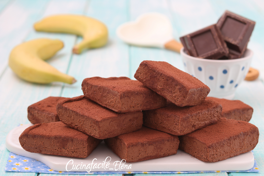 I dolcetti banana e cioccolato sono dei dolci super golosi, veloci e furbissimi. Avevo ancora cioccolato delle uova di Pasqua da smaltire (eh si, quest’anno siamo arrivati a 12 uova, mi sono ritrovata con kg di cioccolato da consumare :D) e ho riciclato gli ultimi pezzi rimasti per preparare questo dolcetto sensazionale. 2 ingredienti, banane e cioccolata (e un po’ di cacao per la finitura), per ottenere un dolcino abbastanza leggero ma troppo buono, senza cottura e così morbido che si scioglie in bocca! I dolcetti banana e cioccolato si preparano in soli 5 minuti, senza farina, lievito, burro, olio, latte o uova, basta frullare i due ingredienti e far riposare il composto, sono perfetti a merenda per iniziare la giornata con il piede giusto ma ottimi anche come snack o a fine pasto, in ogni caso, sono sicura che li amerete, sono piaciuti tantissimo anche alla mia piccolina e sono perfetti per chi ha intolleranze al glutine, uova o lattosio e sono anche vegani (gli ultimi due con i cioccolato fondente, ovviamente) 😀