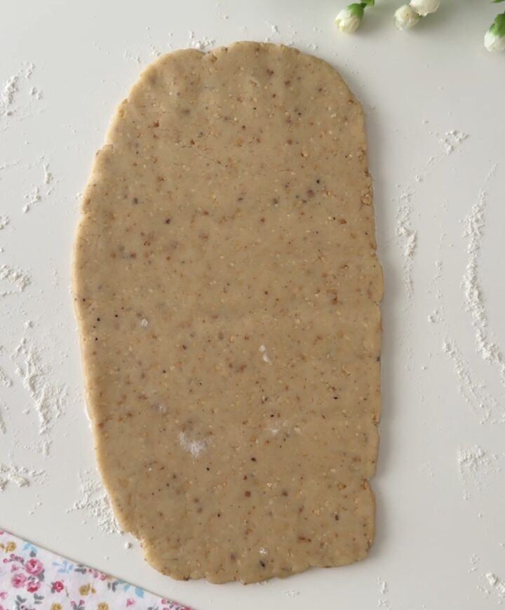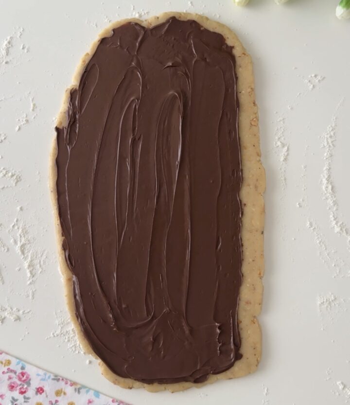 Dividete l’impasto a metà e stendetelo con un matterello a formare un rettangolo allungato, spesso circa mezzo cm. Spalmate un po’ di Nutella sopra, lasciando un po’ di margine lungo uno dei lati più lunghi e arrotolate delicatamente, formando un filoncino. Fate la stessa operazione con il secondo pezzo di impasto.