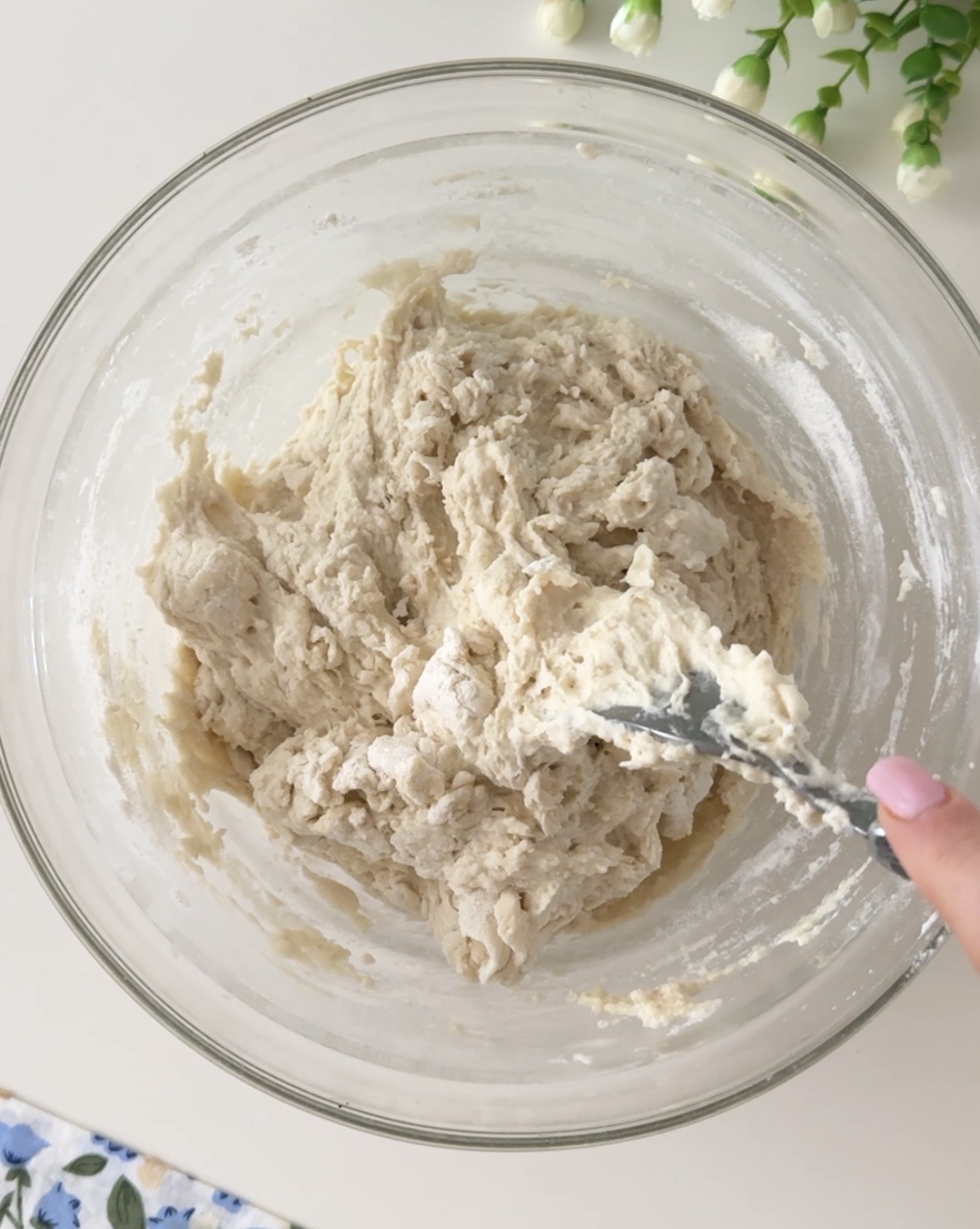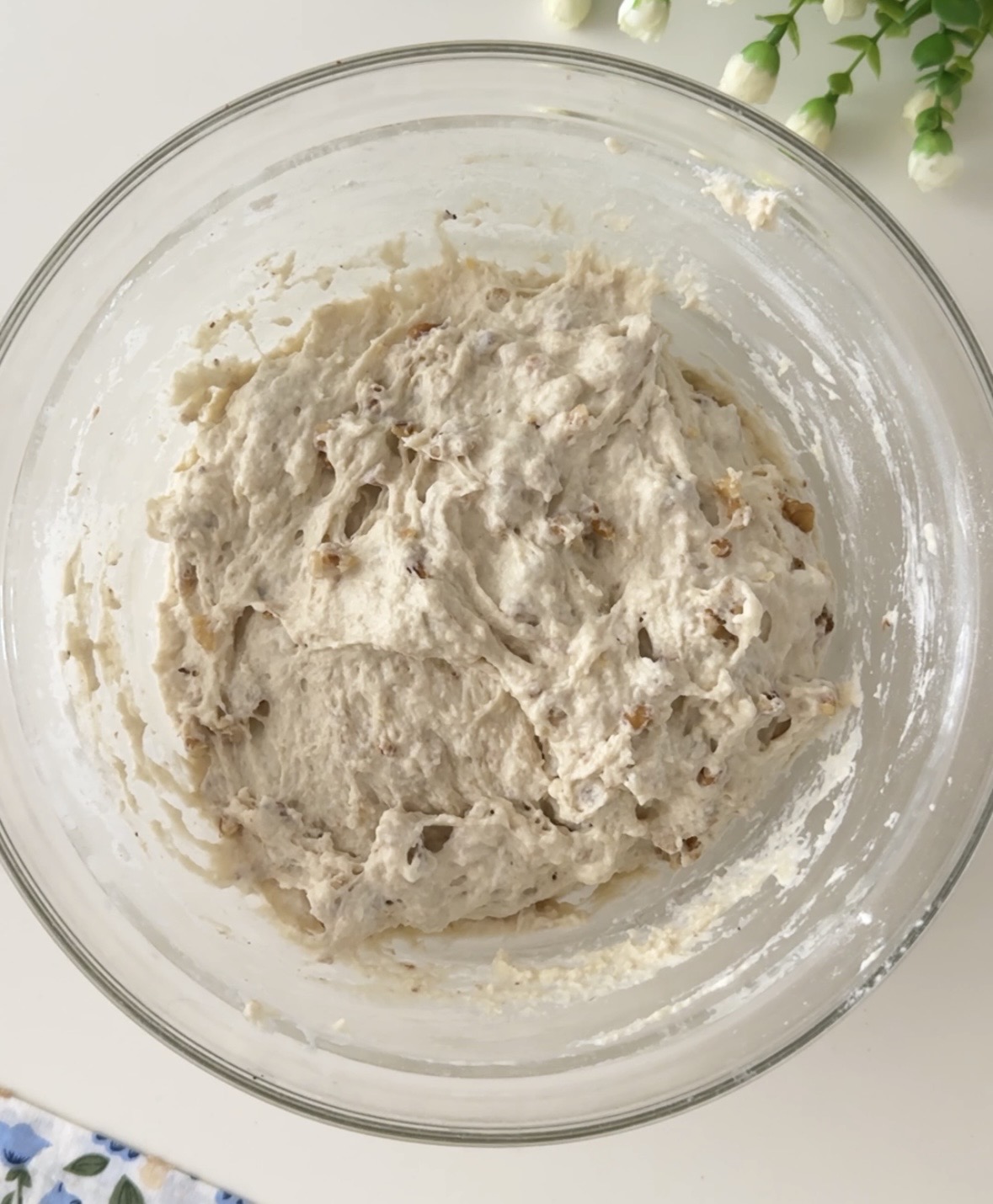 Unite le noci tritate, il sale e fate amalgamare il tutto, sempre con la forchetta. Coprite la ciotola con uno strofinaccio o con della pellicola e lasciate riposare l’impasto per 20 minuti, dopodiché, fate un giro di pieghe veloci, mescolate l’impasto sempre con la forchetta.