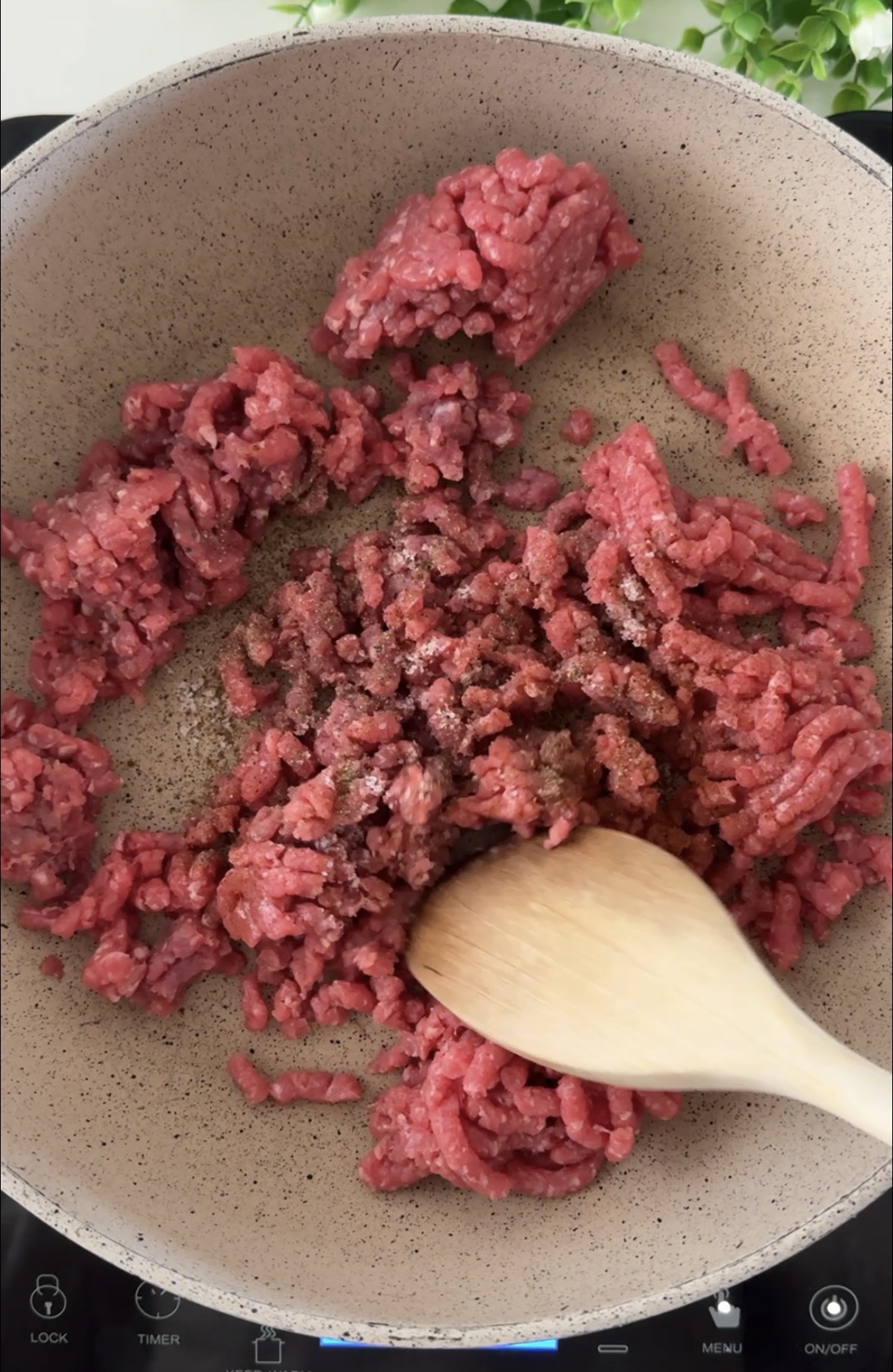 Le focaccine burger sono molto semplici e veloci da preparare, per prima cosa mettete il macinato in un padella antiaderente (io ho usato quello di manzo, ma va bene anche misto, di maiale o pollo), aggiungete sale, pepe nero, paprika e lasciate cuocere per 5/6 minuti, mescolando di tanto in tanto.