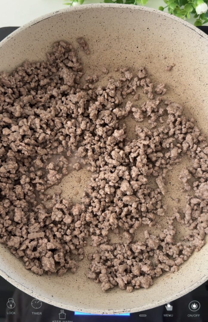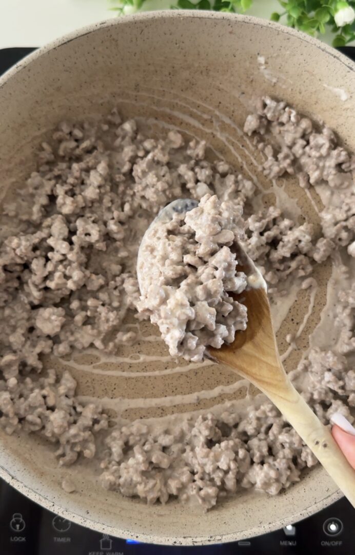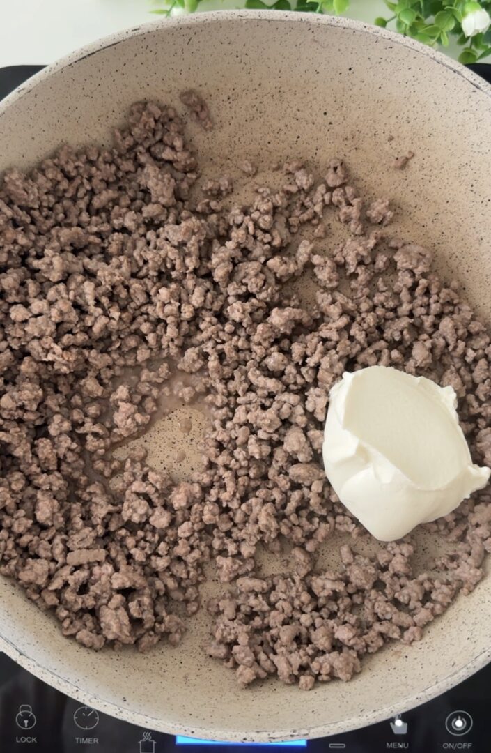 Non appena la carne sarà cotta, aggiungete il formaggio spalmabile e fate amalgamare il tutto.