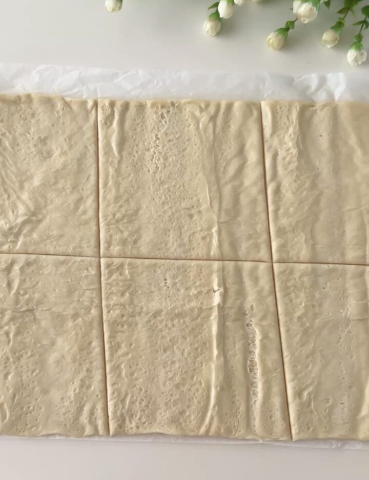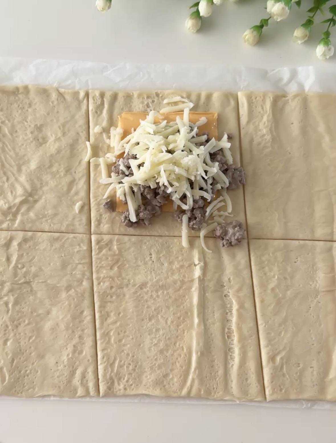 Prendete la base per pizza e tagliatela a metà in orizzontale e in 3 parti in verticale, otterrete, così, 6 pezzi. Farcite ciascun pezzetto con una fettina di formaggio fuso, carne e scamorza grattugiata con una grattugia a fori larghi.