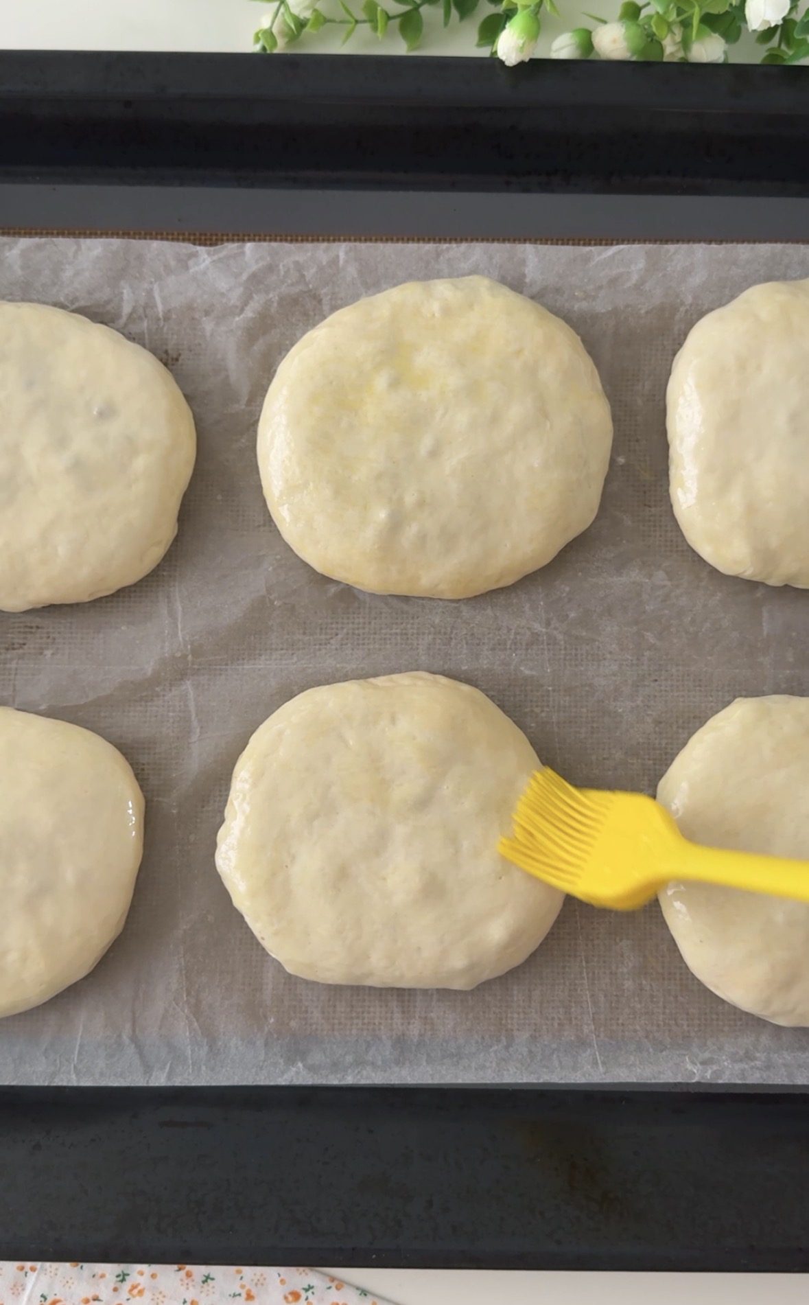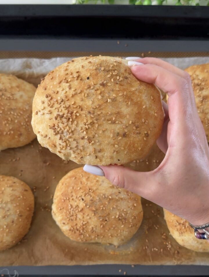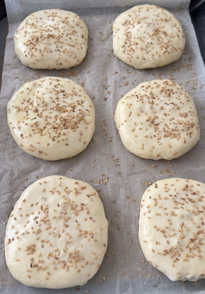 Chiudete bene le focaccine burger, schiacciatele leggermente e sistematela su una teglia foderata con carta forno, spennellatele con un mix di acqua ed olio (due cucchiai di acqua e uno di olio), aggiungete i semini di sesamo e cuocetele in forno preriscaldato a 200 gradi per 20 minuti circa, devono risultare dorate.