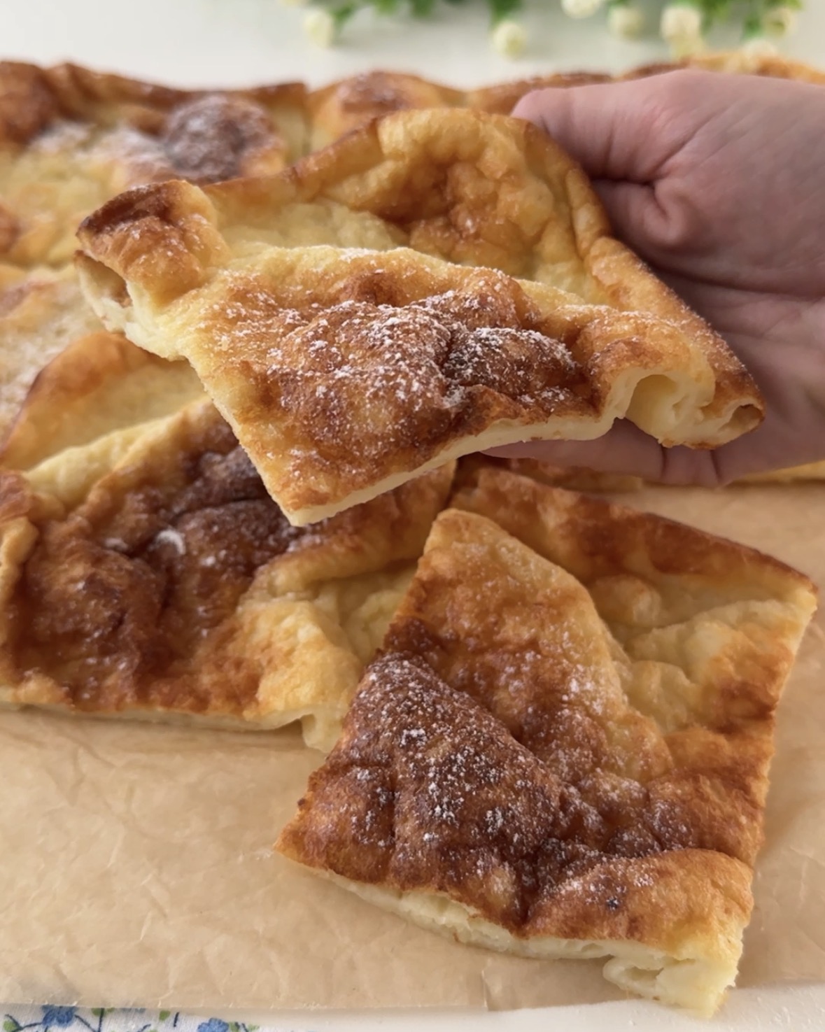 La frittellona al forno è pronta da servire, guarnitela con una leggera spolverata di zucchero a velo, se volete e servitela da sola o accompagnandola con ciò che preferite.