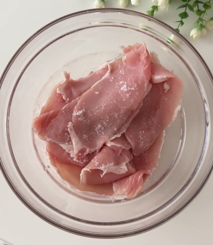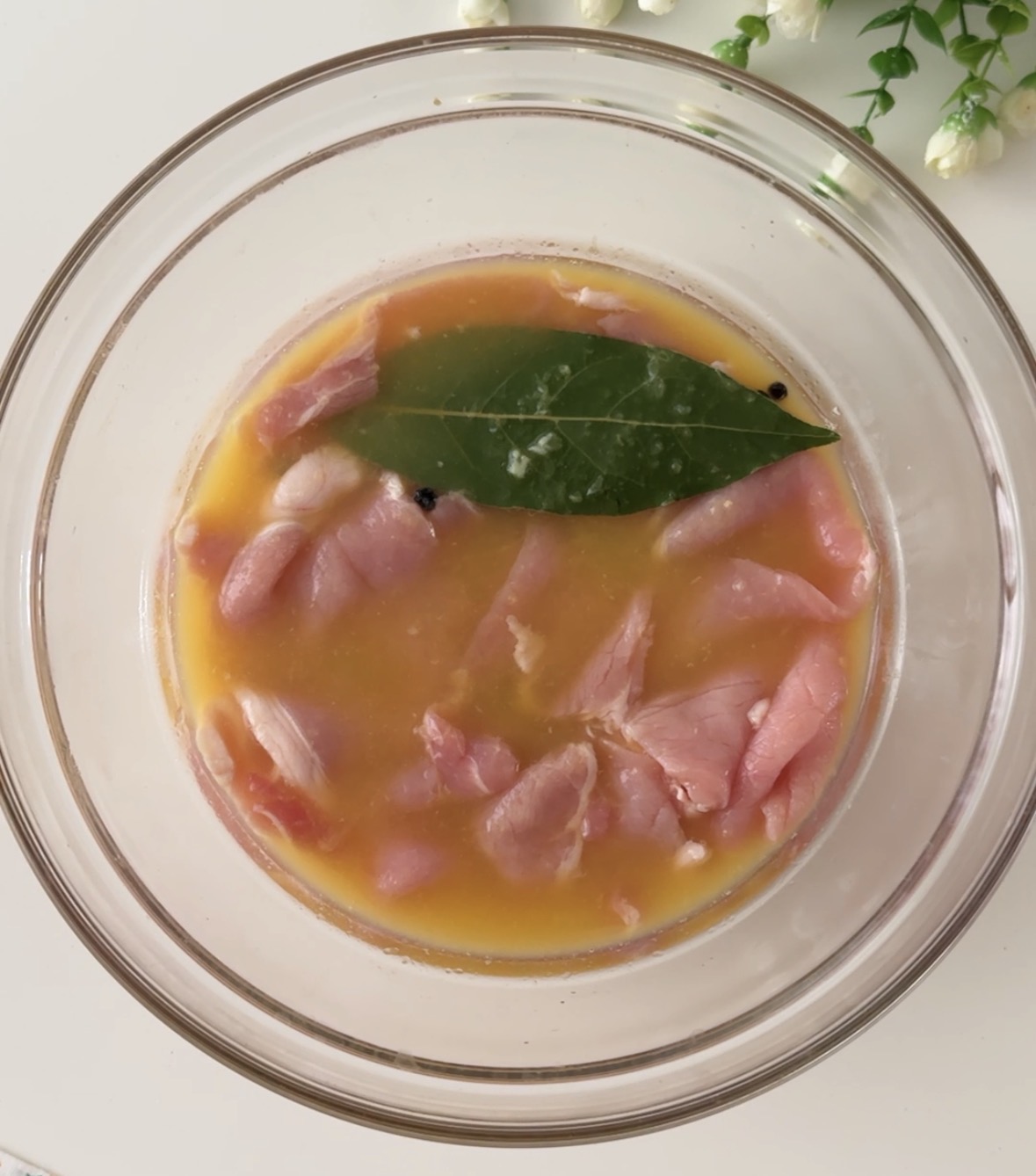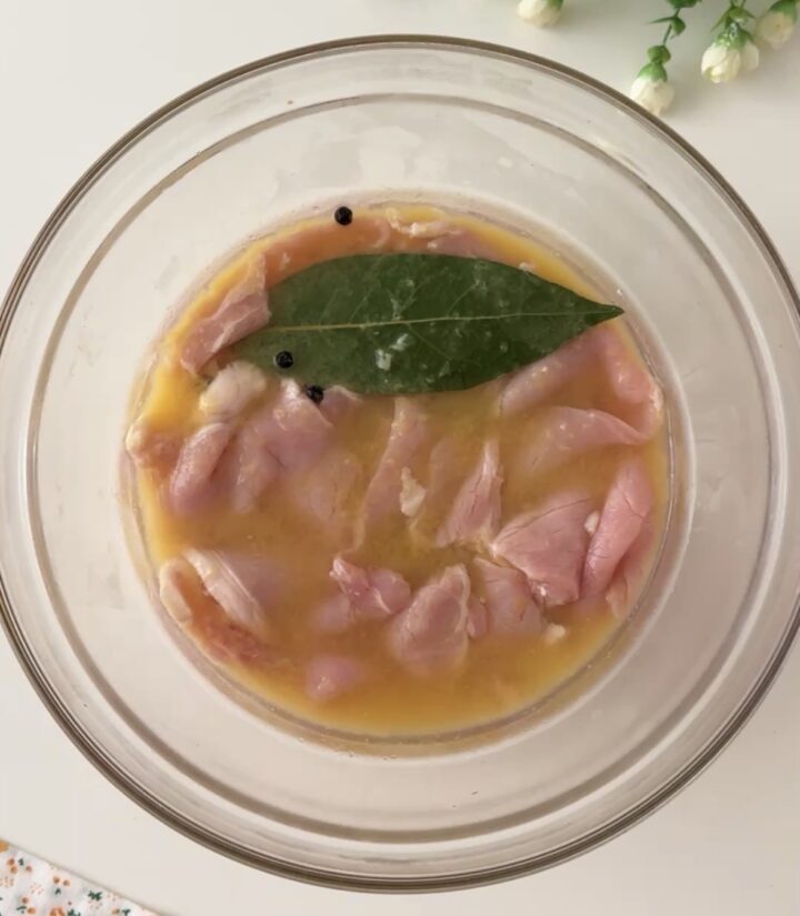 Gli involtini all’arancia alla Siciliana sono molto semplici e velocissimi da preparare, per prima cosa mettete le fettine di carne in una ciotola, salatele e aggiungete l’alloro, qualche grano di pepe nero e il succo di arancia, coprite con della pellicola e lasciate riposare in frigo per almeno 30 minuti.