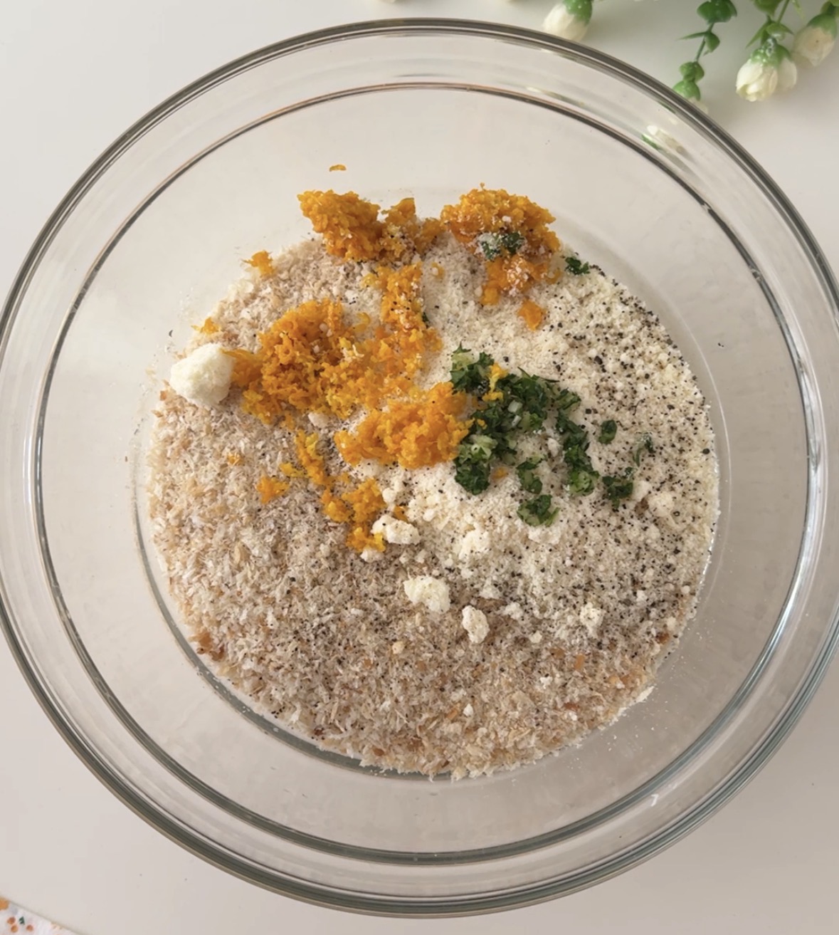 Preparate la panatura mescolando pangrattato, pecorino grattugiato, aglio e prezzemolo tritati, pepe nero e scorza grattugiata delle arance.