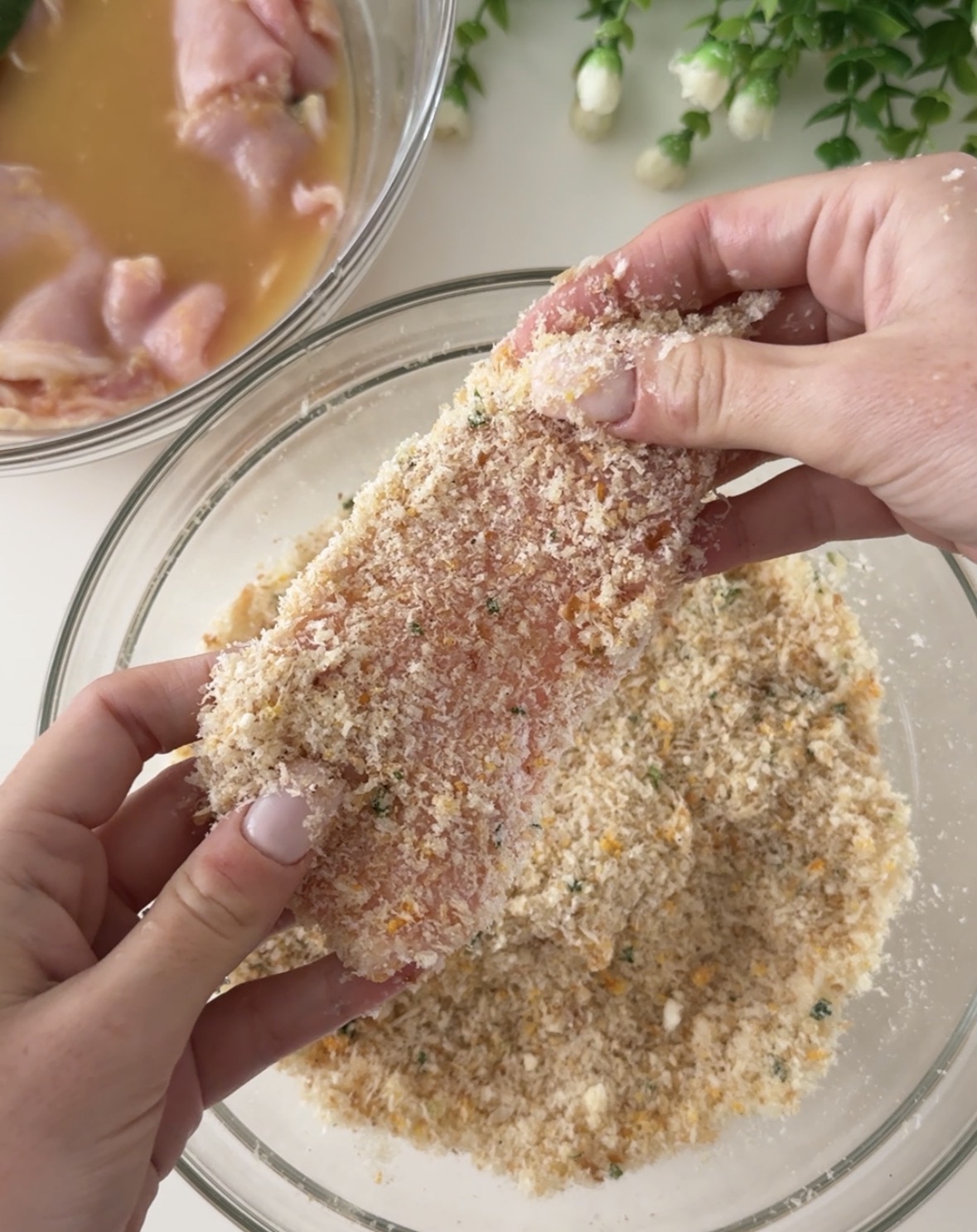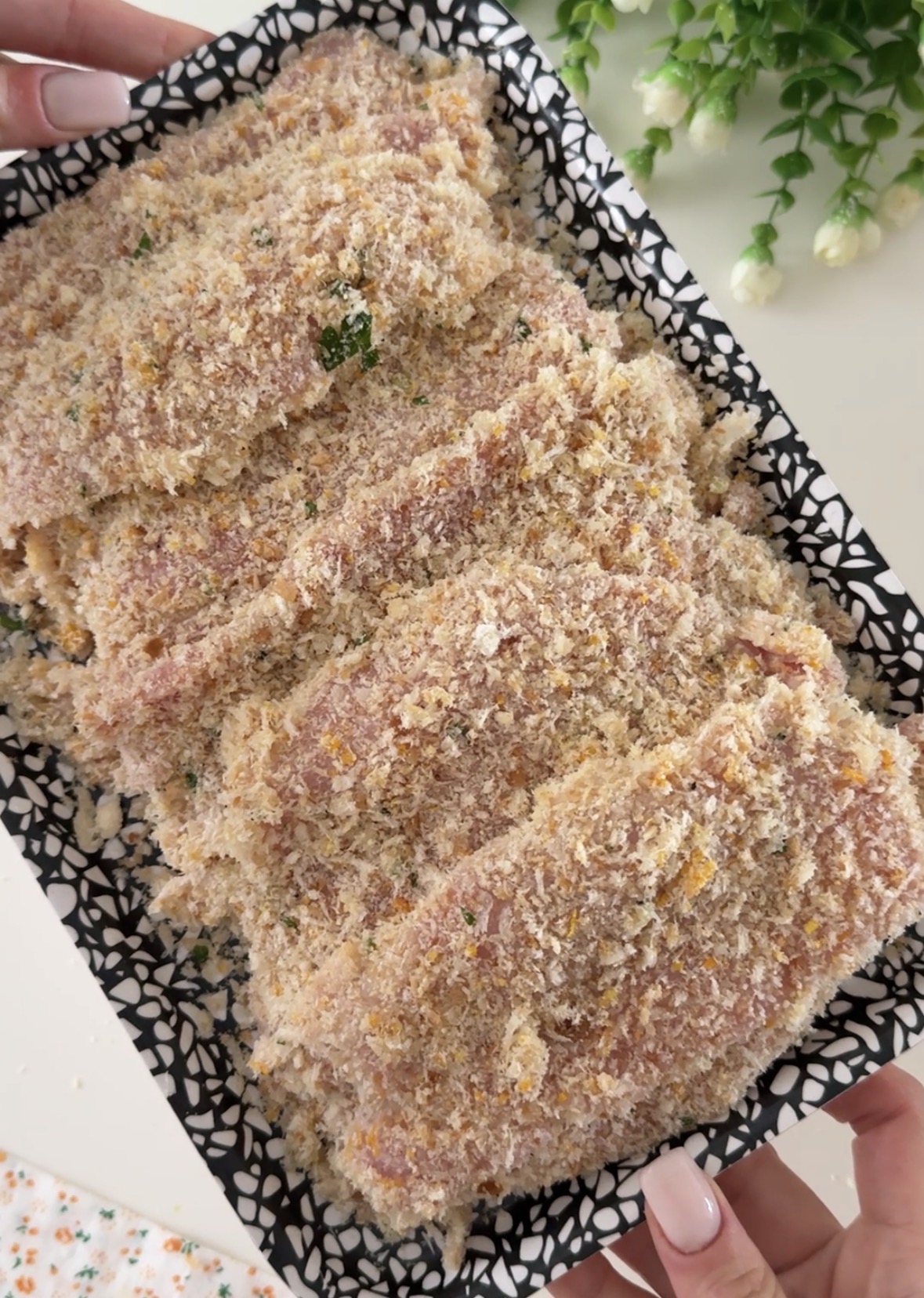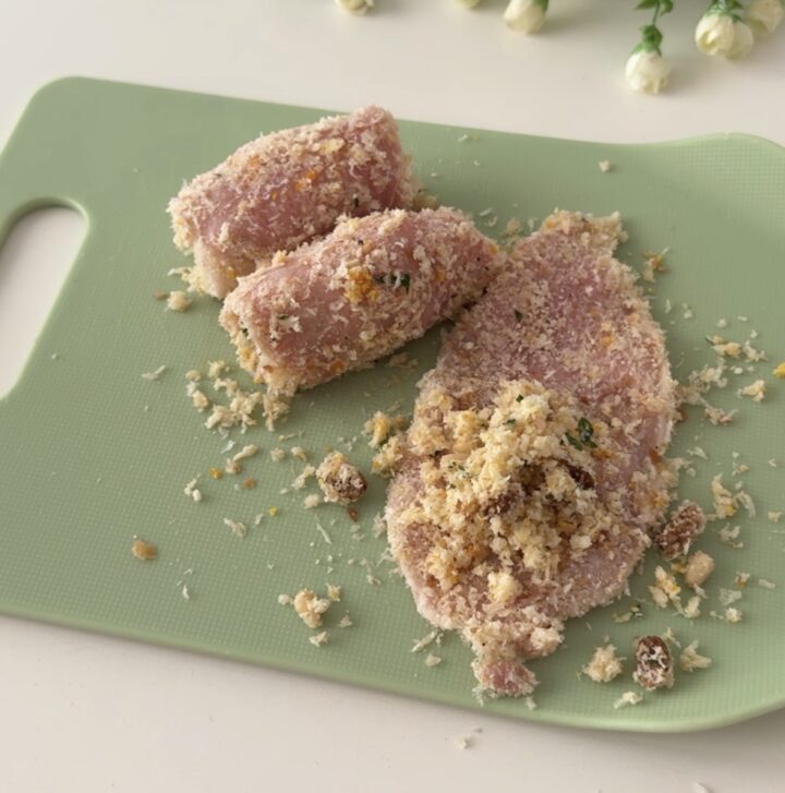Panate tutte le fettine di carne, prelevandole direttamente dalla ciotola, su entrambi i lati.