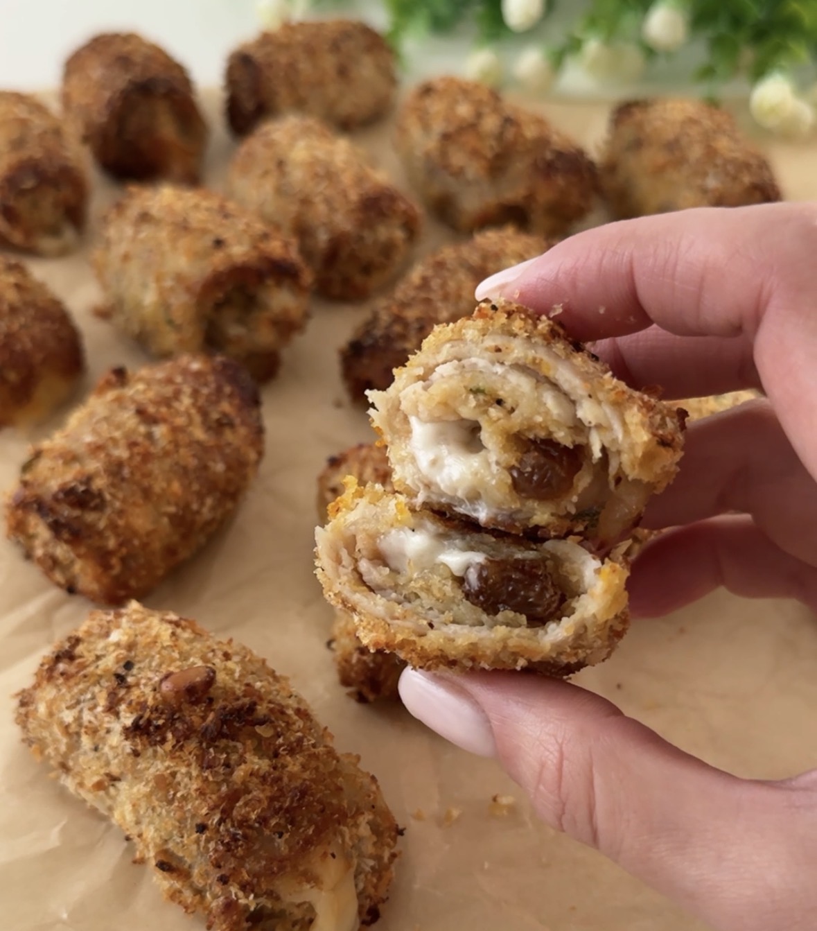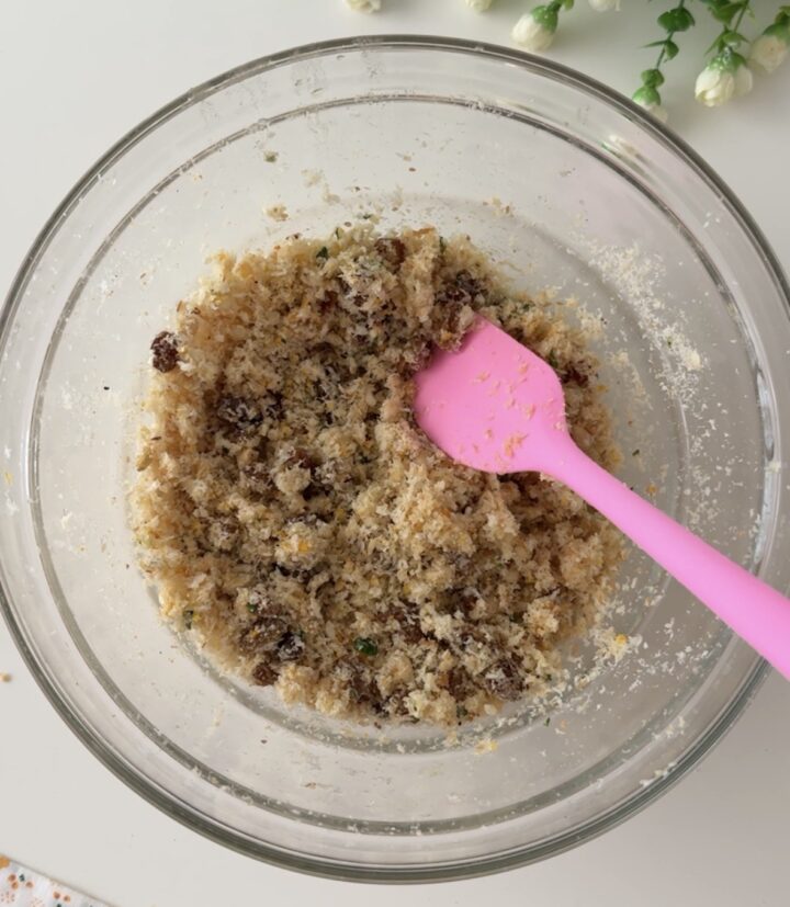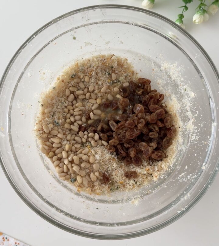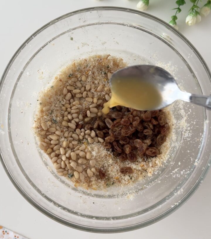 Alla panatura rimasta, aggiungete l’uvetta messa in ammollo e ben scolata, i pinoli e 6 cucchiai della marinatura usata per la carne, date una bella mescolata.