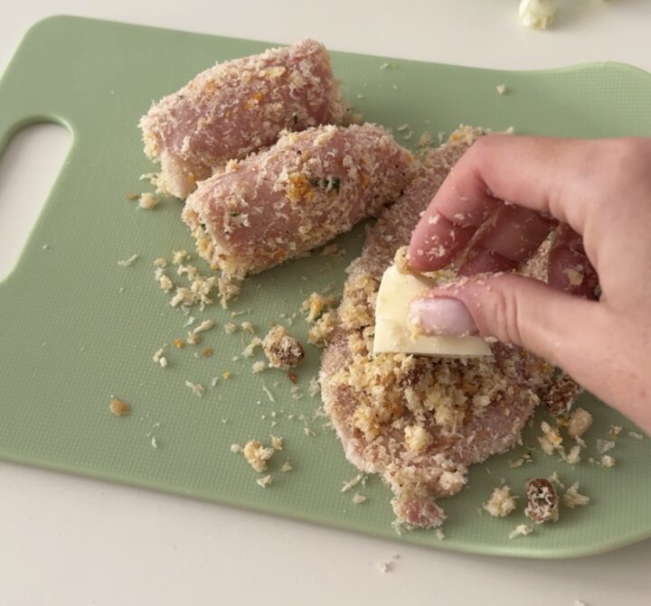 Prendete una fettina di carne, farcitela con un po’ di mollica condita e con un pezzettino di formaggio e formate un involtino, procedete in questo modo per realizzare tutti gli involtini all’arancia, potete scegliere se lasciarli così o se fare degli spiedini, io non ho usato gli stecchini.