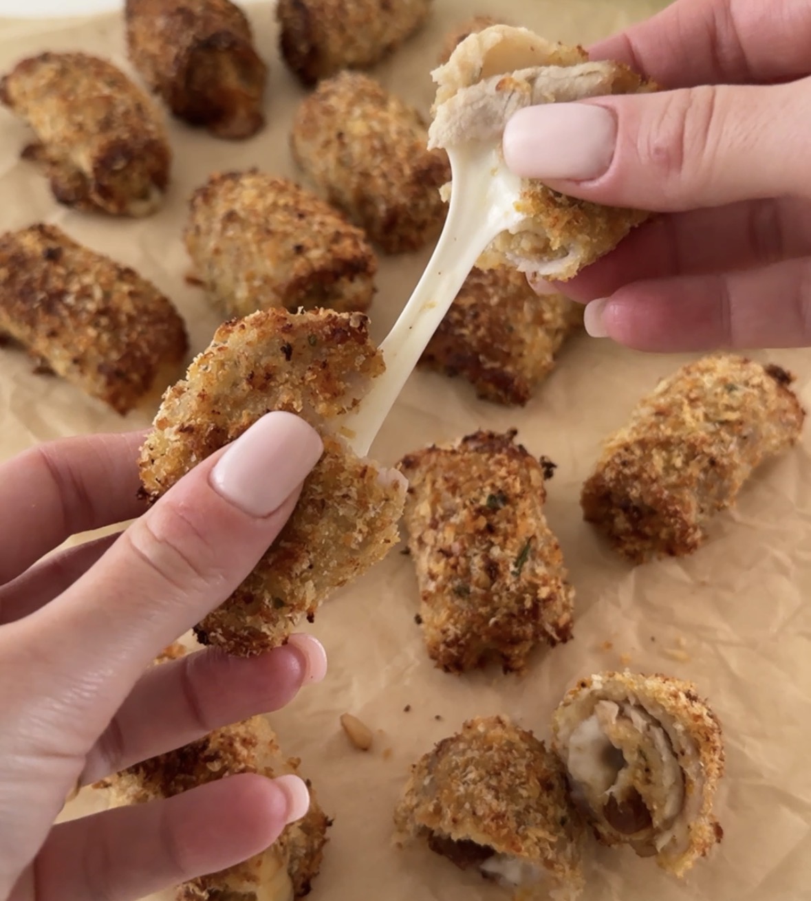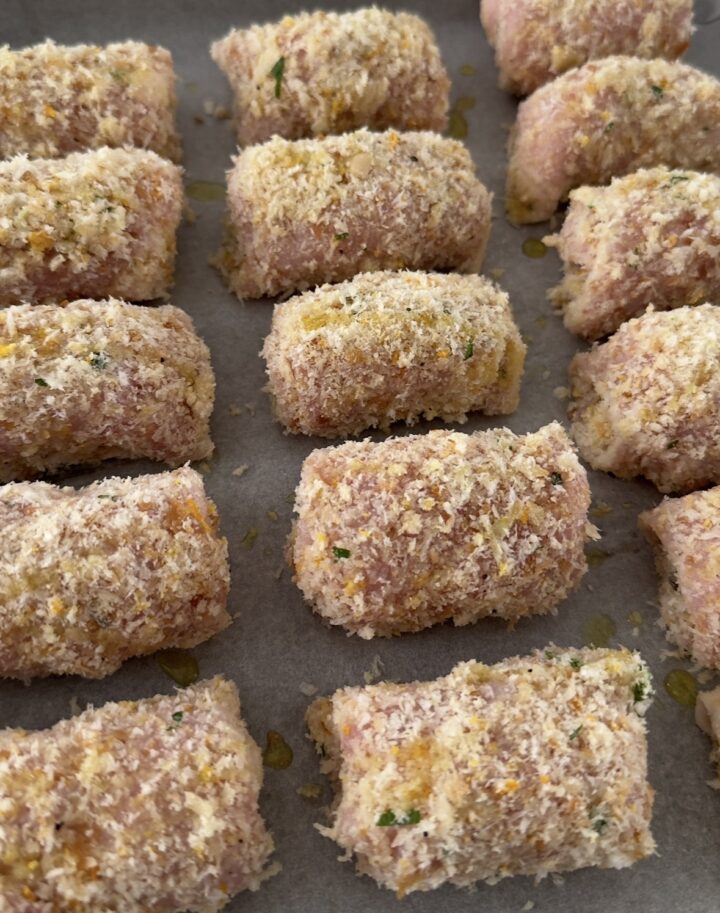 Disponete gli involtini all’arancia su una teglia foderata con carta forno (rivolgete la parte della chiusura verso il basso per evitare che si aprano), versate sopra un filo di olio e cuoceteli in forno preriscaldato a 180 gradi per 20/25 minuti (o in friggitrice ad aria a 180 gradi per 18/20 minuti), devono risultare ben dorati.