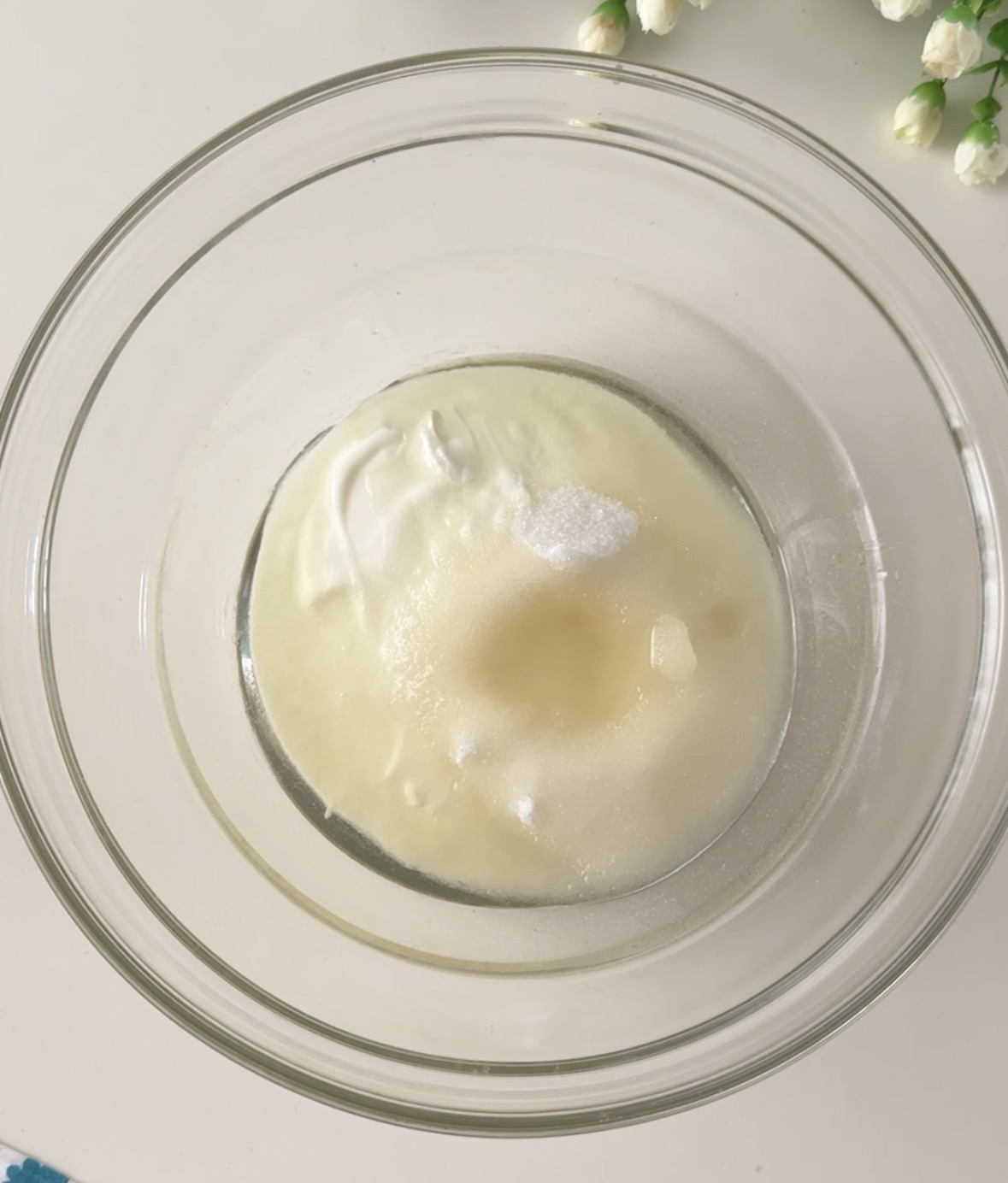 Le mezzelune allo yogurt sono molto semplici e veloci da preparare, per prima cosa mettete in una ciotola lo yogurt bianco non zuccherato, lo zucchero, l’olio di semi e mescolate con una forchetta.