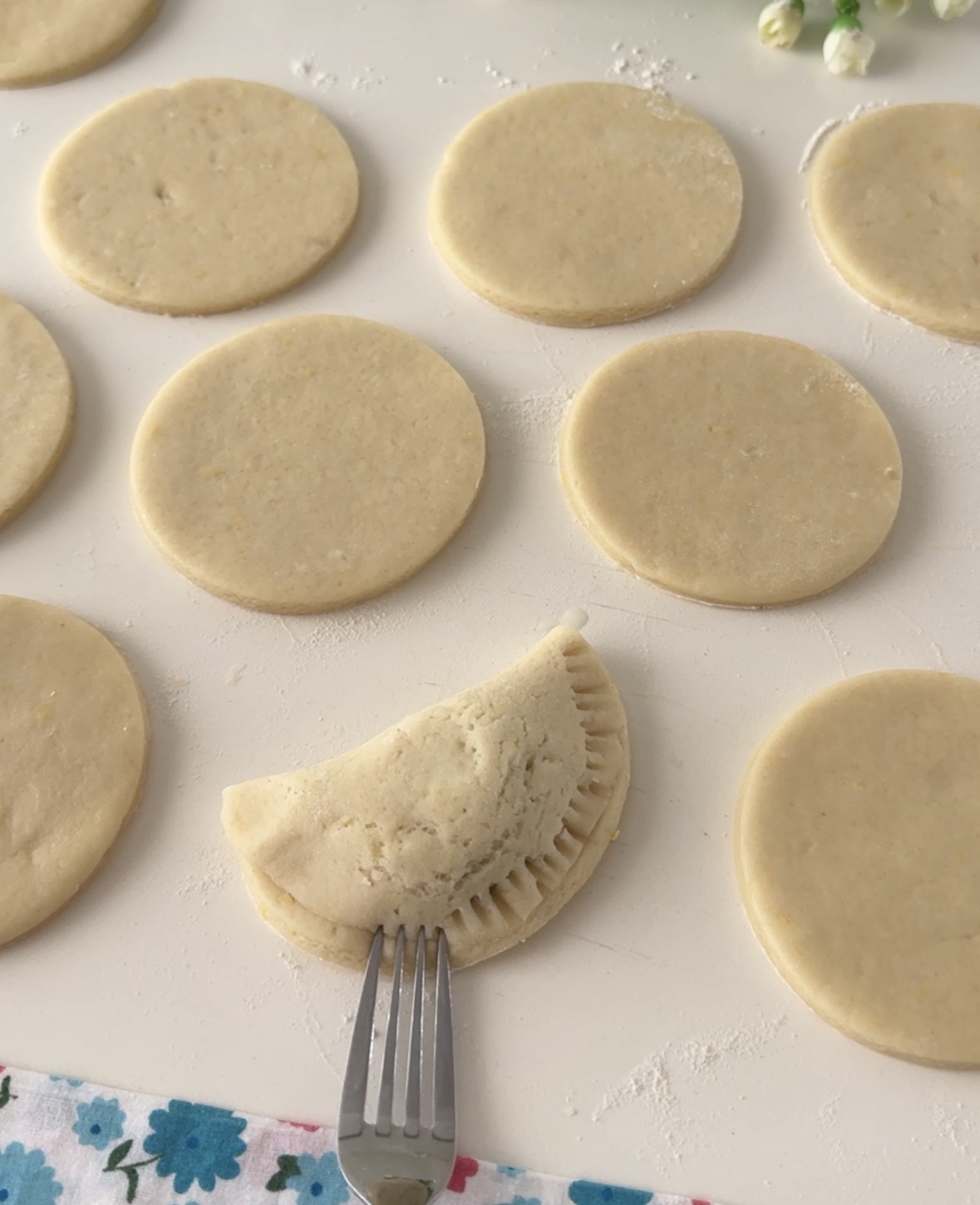 Farcite la parte centrale con il ripieno che preferite (io ho usato Nutella, marmellata e crema al pistacchio), chiudete a mezzaluna, schiacciate bene i bordi e sigillateli con i rebbi di una forchettina.