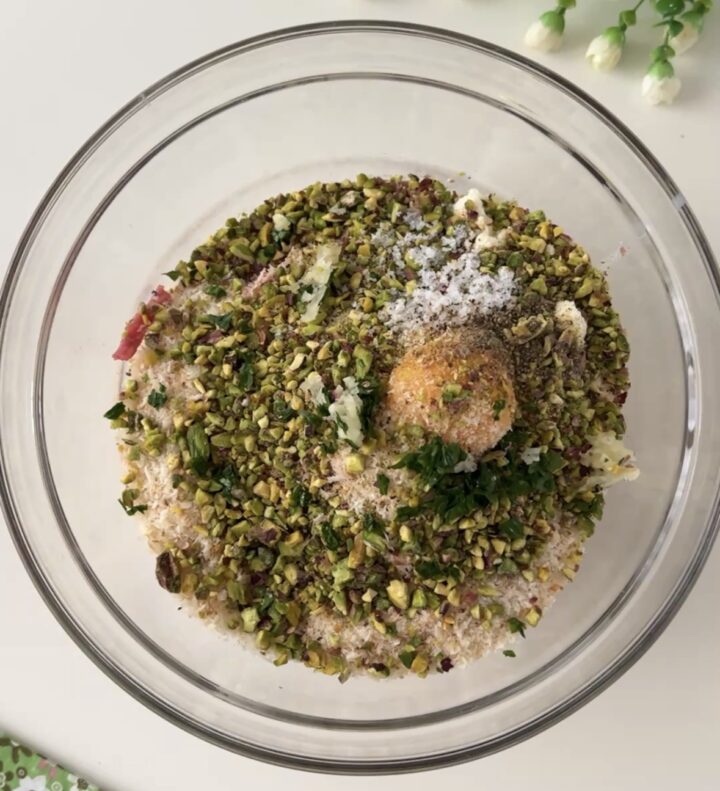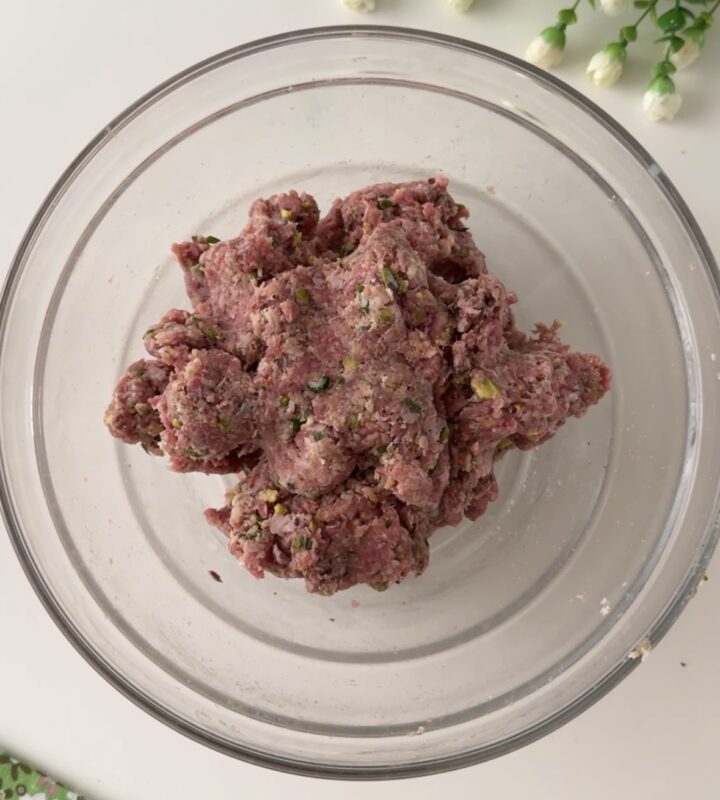 Il polpettone mortadella e pistacchio è molto semplice e velocissimo da preparare, per prima cosa mettete in una ciotola il macinato, la mortadella tritata, parmigiano grattugiato, uovo, mollica, latte, pistacchi, aglio e prezzemolo tritati, sale, pepe e fate amalgamare per bene tutti gli ingredienti.