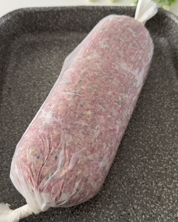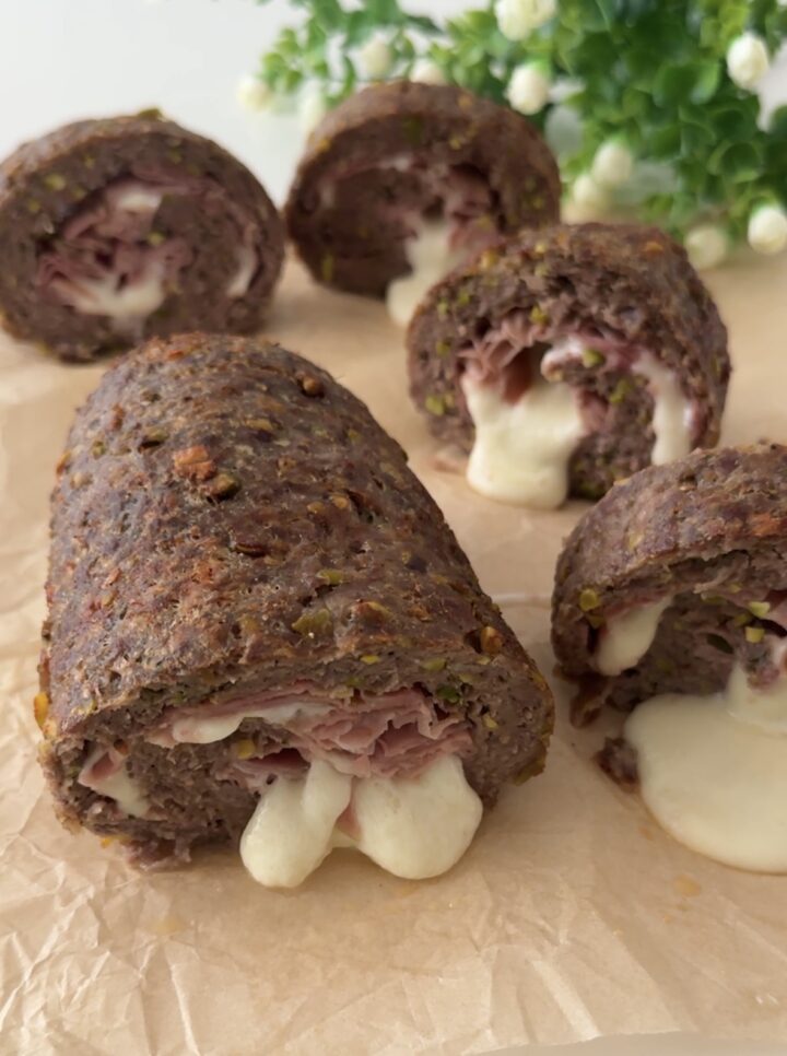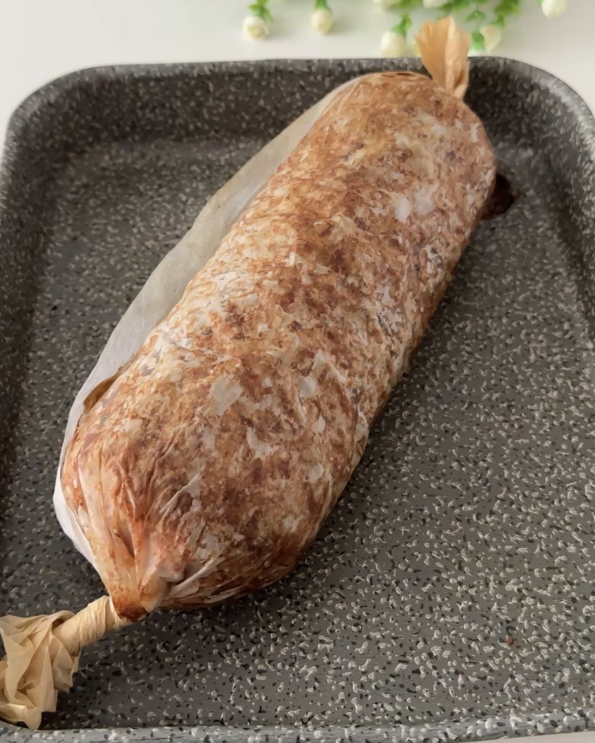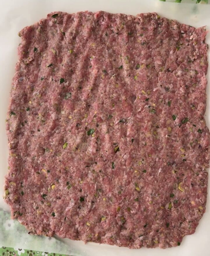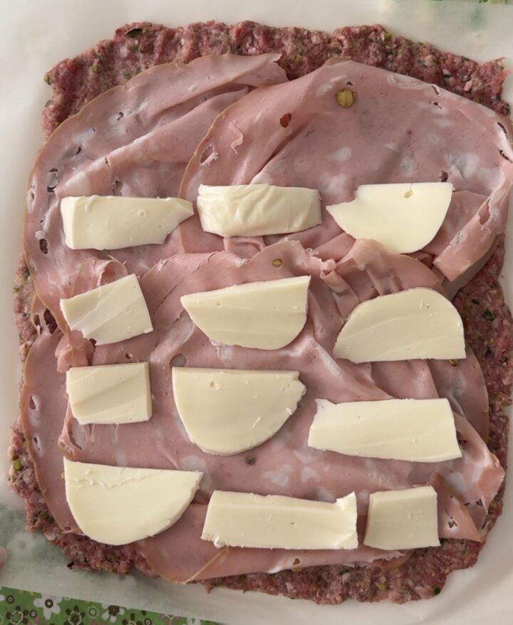 Aiutandovi con la carta forno sottostante, formate un rotolo e chiudetelo a mo’ di caramella, trasferite il polpettone mortadella e pistacchio su una teglia e cuocetelo in forno preriscaldato a 180 gradi per 35 minuti.