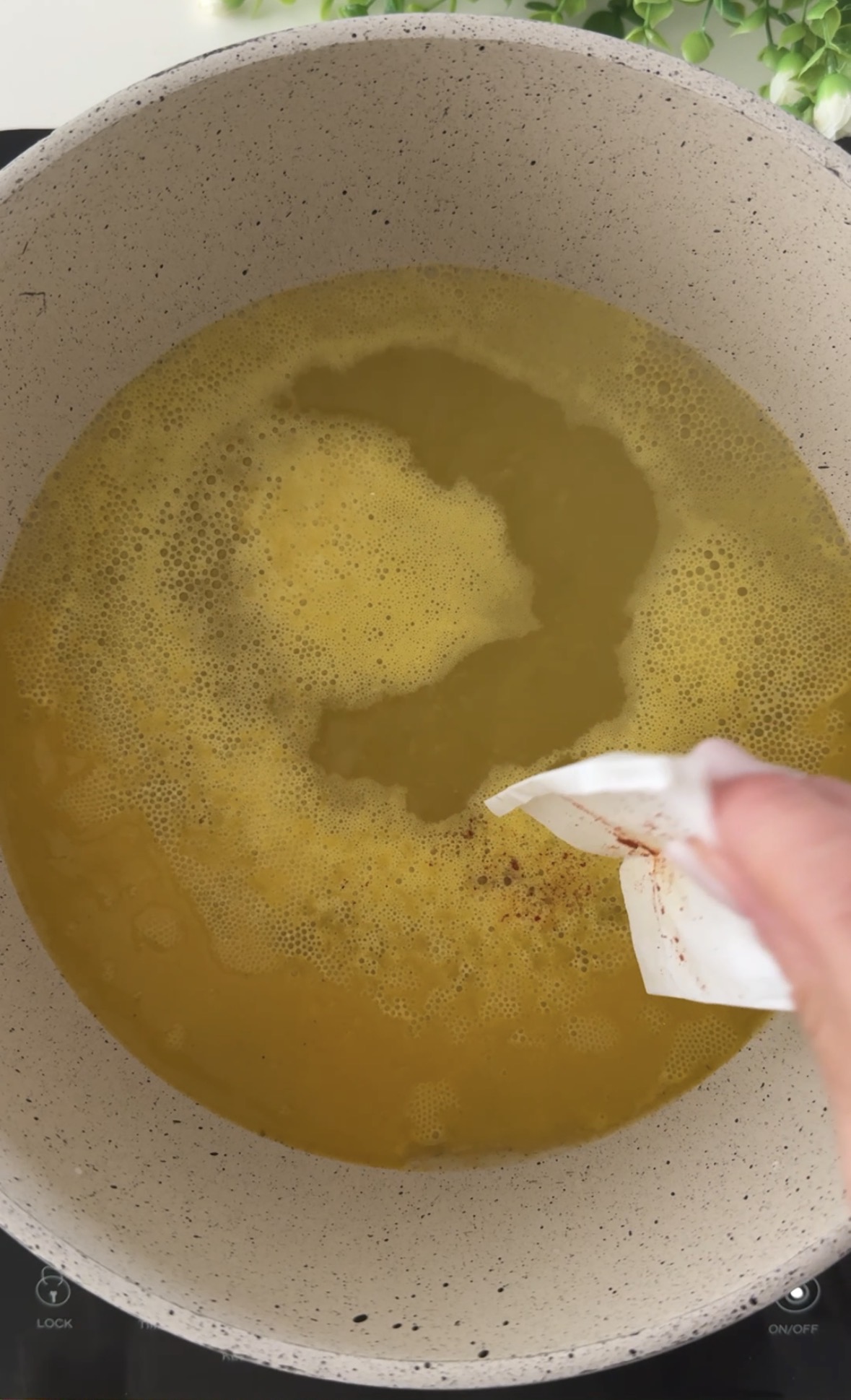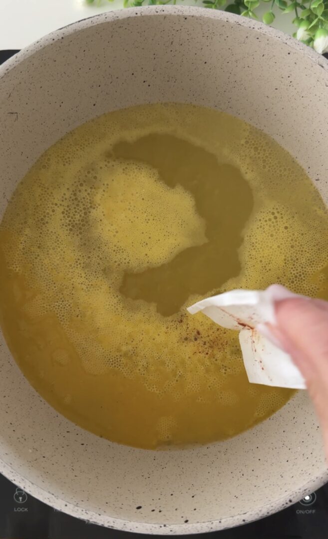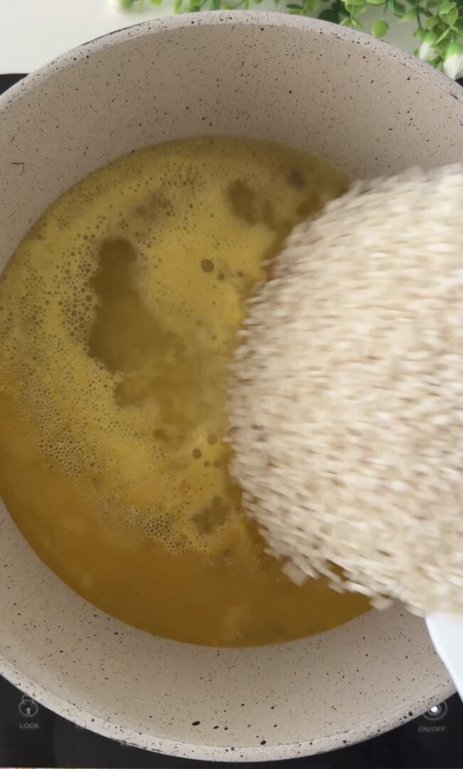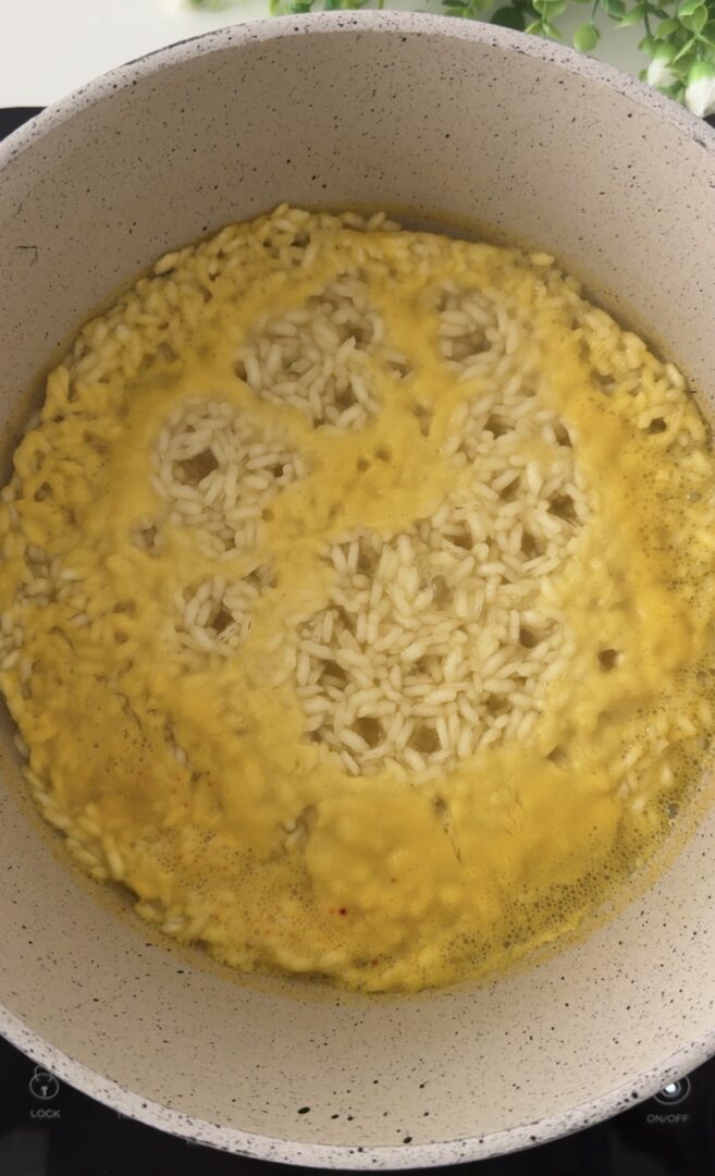 Portate il brodo o l’acqua ad ebollizione (io ho usato il brodo vegetale, ma va bene anche quello di carne, se usate l’acqua, salatela), aggiungete lo zafferano, il riso per risotti (carnaroli, ma anche arborio o Roma), date una mescolata veloce e, senza più toccarlo, lasciatelo cuocere per 12/15 minuti, il riso assorbirà tutto il liquido e non si attaccherà alla pentola (anzi, si attaccherà se lo toccherete, non mettete il coperchio e usate, preferibilmente, una pentola antiaderente).