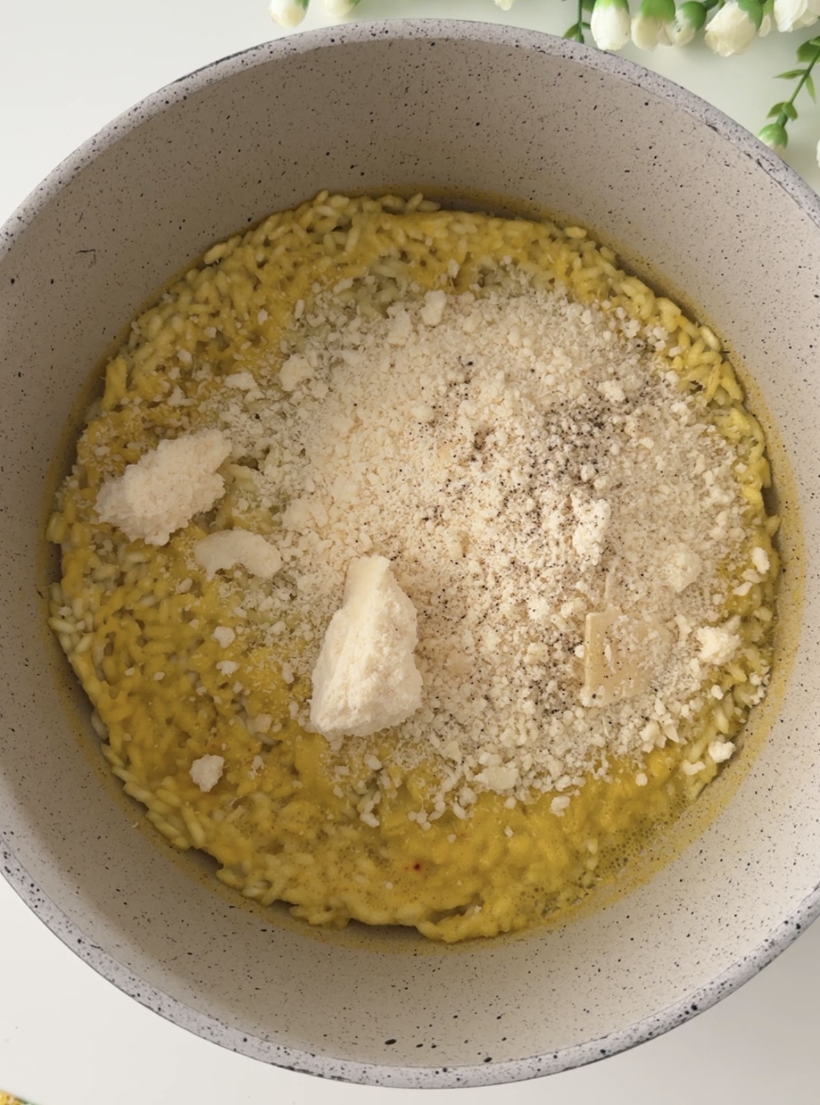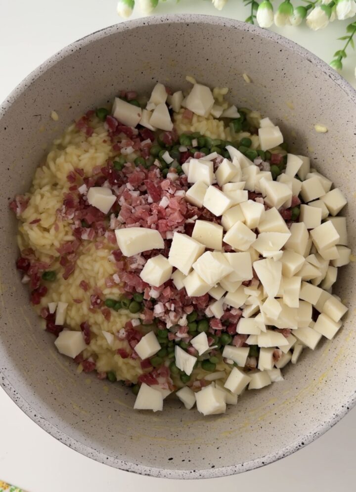 Non appena il riso sarà pronto, spostatelo dal fuoco e conditelo con parmigiano grattugiato e pepe nero, aggiungete poi i piselli, lo speck a piccoli dadini e la scamorza a pezzettini.