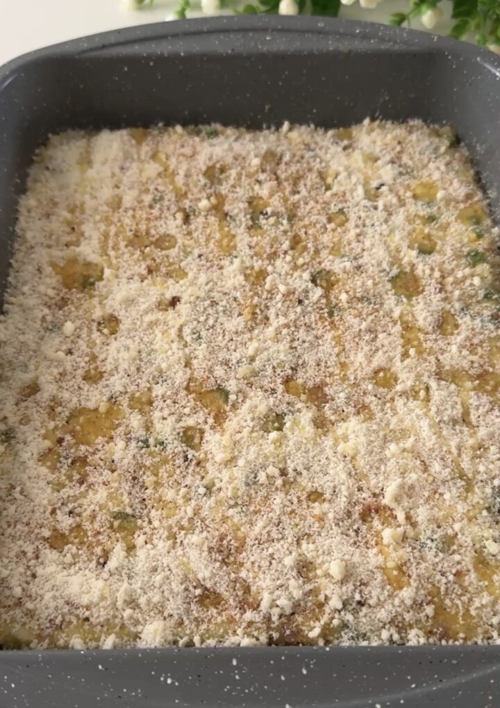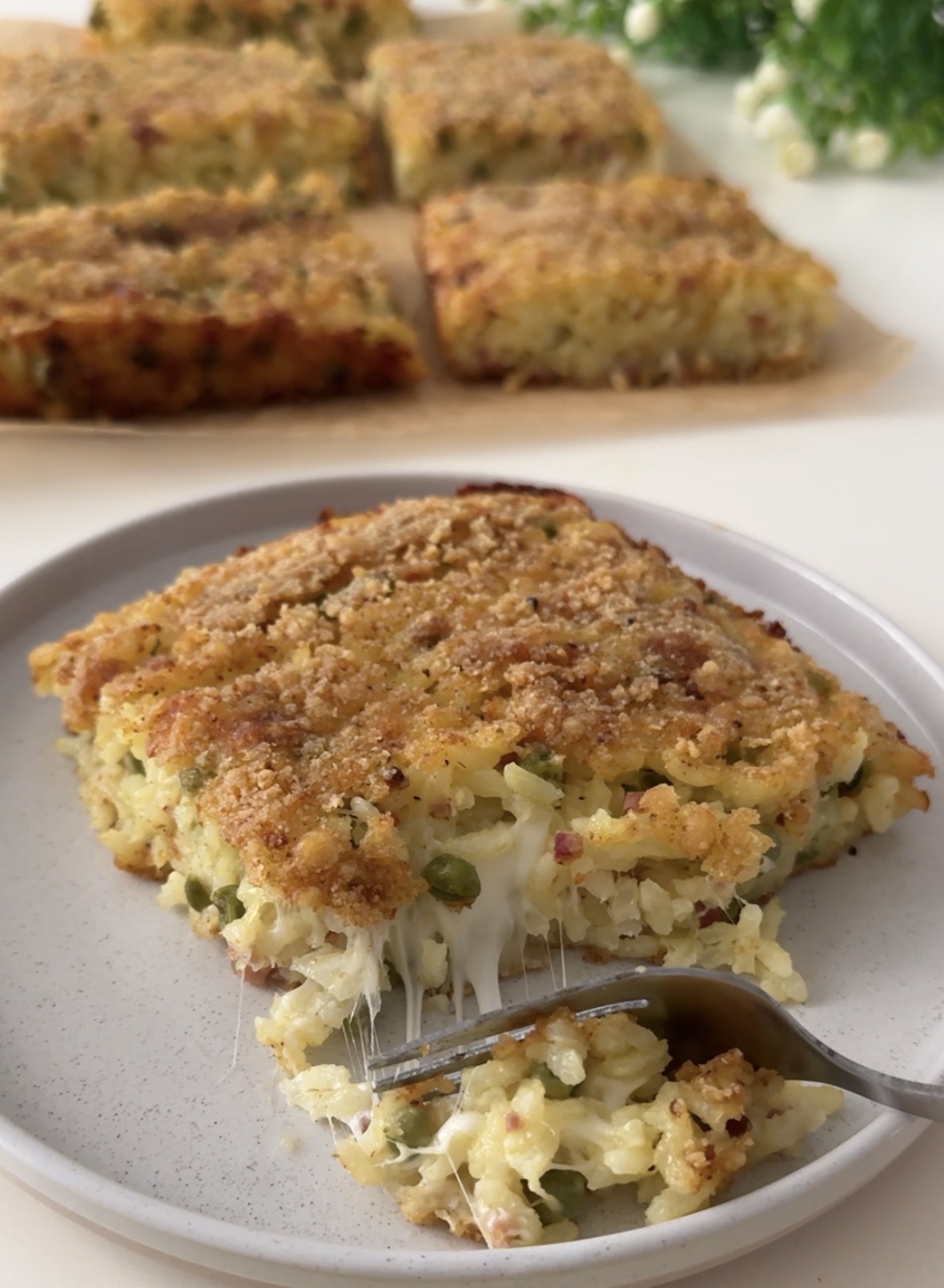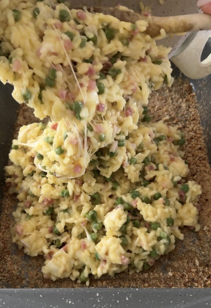 Il riso al forno con piselli e speck si conserva a temperatura ambiente per qualche ora o in frigo per un paio di giorni. Potete anche prepararlo in anticipo il giorno prima, tenerlo in frigo e cuocerlo il giorno dopo. Se non avete lo zafferano, potete semplicemente ometterlo. Io ho usato una teglia da 25×30 cm. Per una versione completamente senza glutine, usate il pangrattato senza glutine o la farina di mais (preparato per polenta).