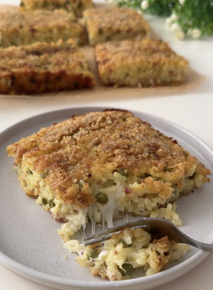 Trasferite il riso in una teglia leggermente unta con dell’olio e cosparsa con del pangrattato e livellatelo per bene, mettete sopra una spolverata di pangrattato e di parmigiano grattugiato, un filo di olio e cuocetelo in forno preriscaldato a 200 gradi per 20 minuti, deve risultare dorato. Lasciatelo intiepidire, tagliatelo e servitelo.