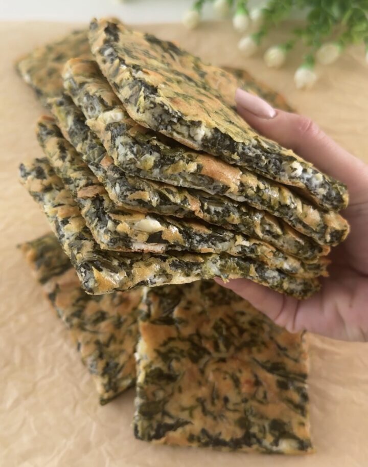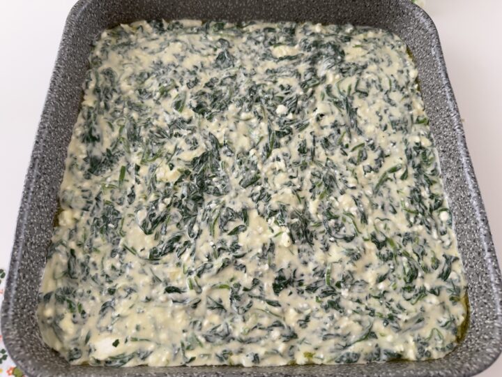 Trasferite il composto in una teglia antiaderente leggermente unta con dell’olio (o foderata con carta forno) e livellatelo per bene, cuocete la schiacciata di spinaci in forno preriscaldato a 210 gradi per 20 minuti circa, deve risultare ben dorata.