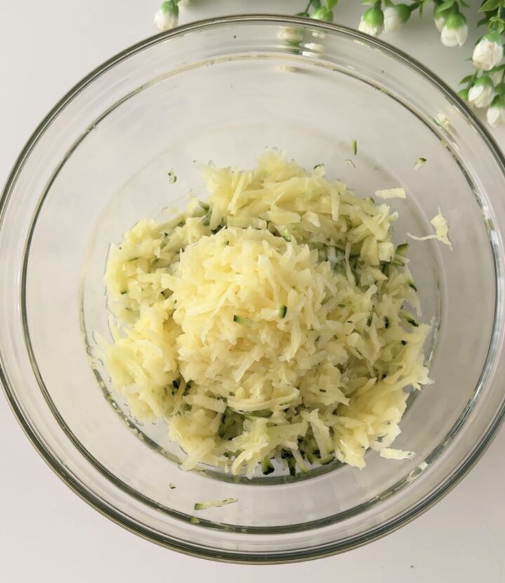 La schiacciata zucchine e patate è molto semplice e veloce da preparare, per prima cosa pulite la zucchina e grattugiatela con una grattugia a fori larghi, sbucciate le patate e grattugiate anch’esse.