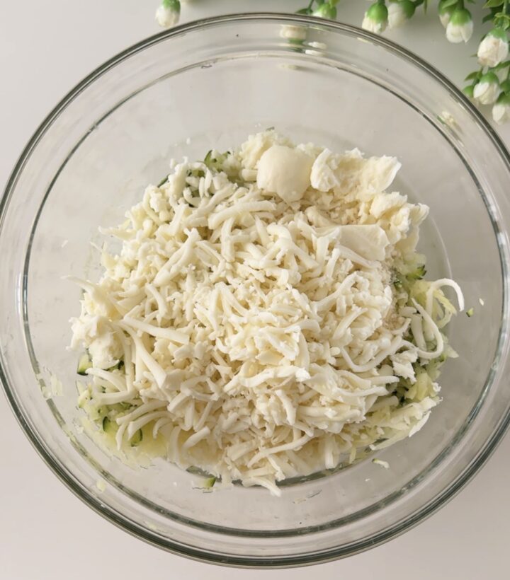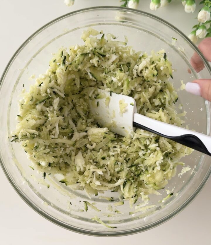 Tamponate le verdure con della carta da cucina per eliminare i liquidi in eccesso e condite con sale, pepe nero, parmigiano grattugiato, scamorza grattugiata con la grattugia a fori larghi e fate amalgamare per bene il tutto.