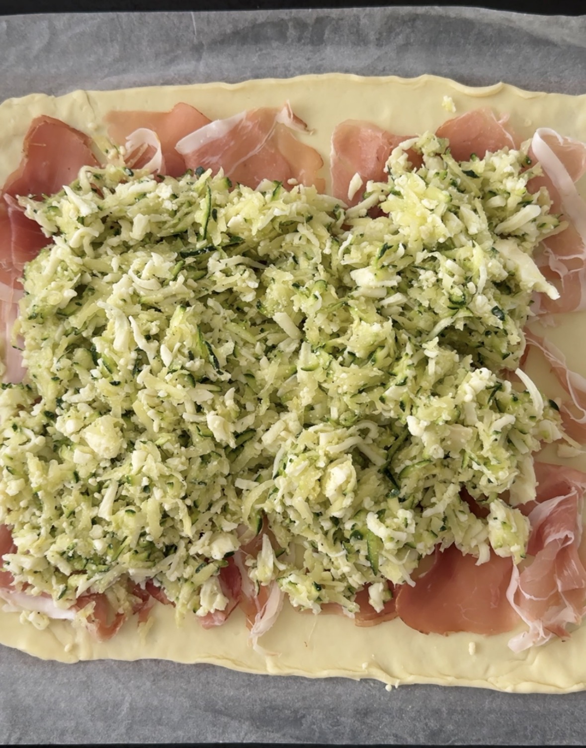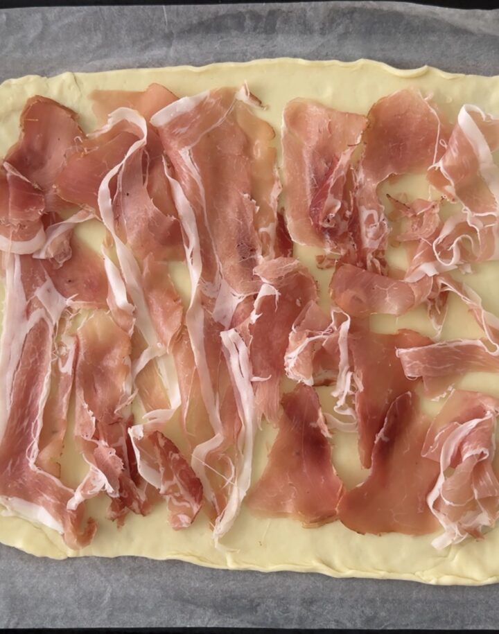 Farcite la pasta brisee con le fettine di speck e aggiungete il composto preparato in precedenza, livellatelo per bene e ripiegate i bordi verso l’interno.