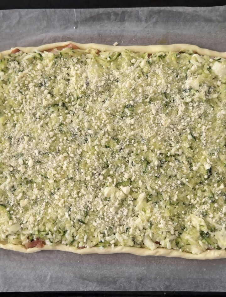 Spruzzate (o versate) un po’ di olio extra vergine di oliva sopra, mettete una spolverata di parmigiano grattugiato e cuocete la schiacciata zucchine e patate in forno preriscaldato a 200 gradi per 25 minuti circa, deve risultare ben dorata.