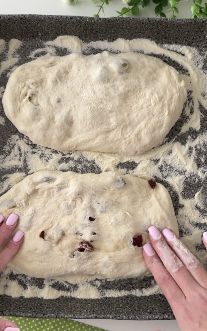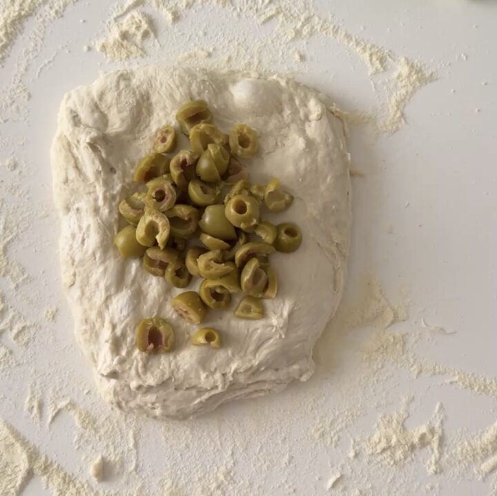 Terminato l’ultimo giro di pieghe, lavorate l’impasto su un piano con della semola e aggiungete , se volete, gli ingredienti che preferite, io l’ho diviso a metà e ho messo olive verdi denocciolate in una e pomodori secchi a pezzettini nell’altra.