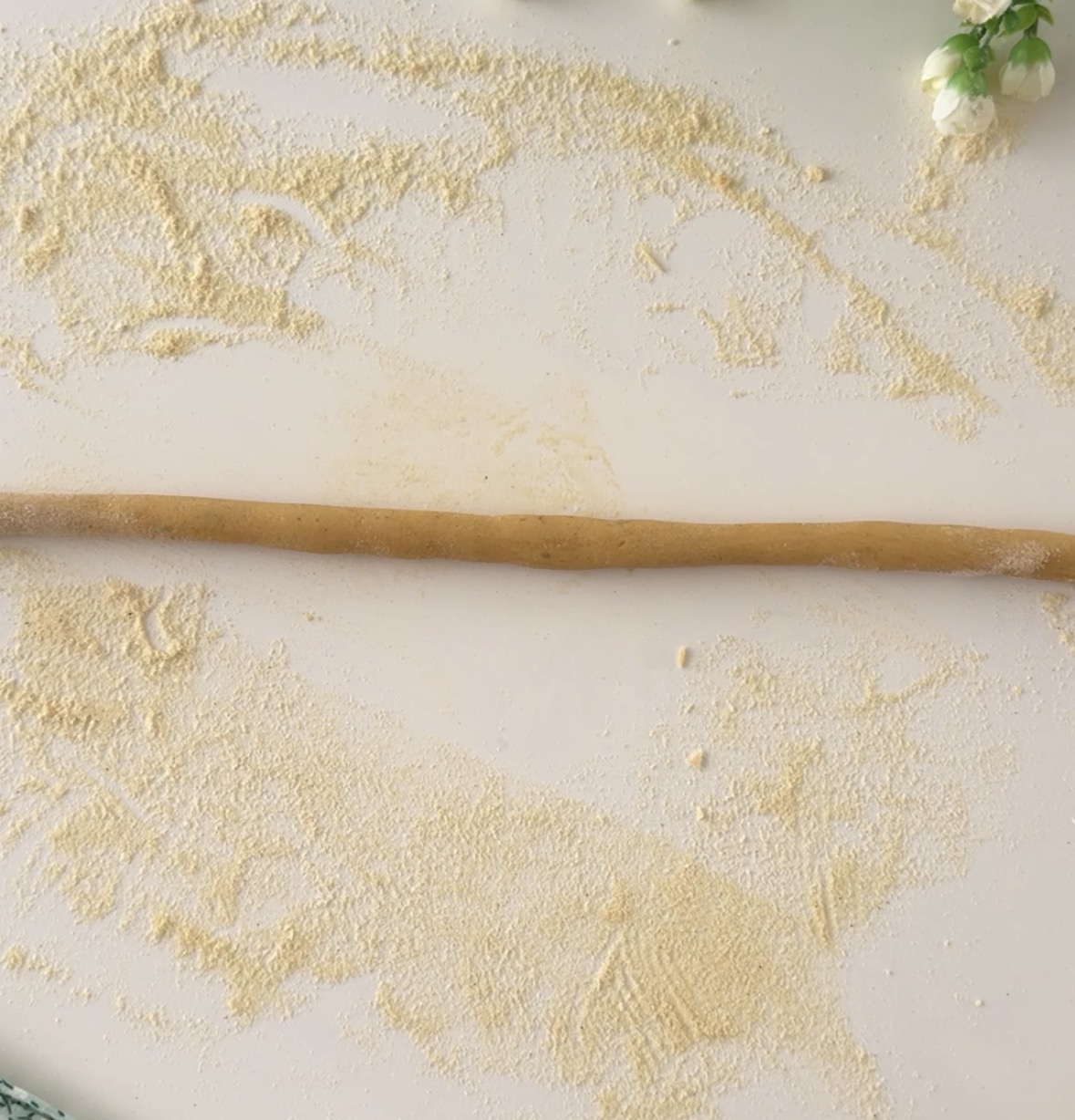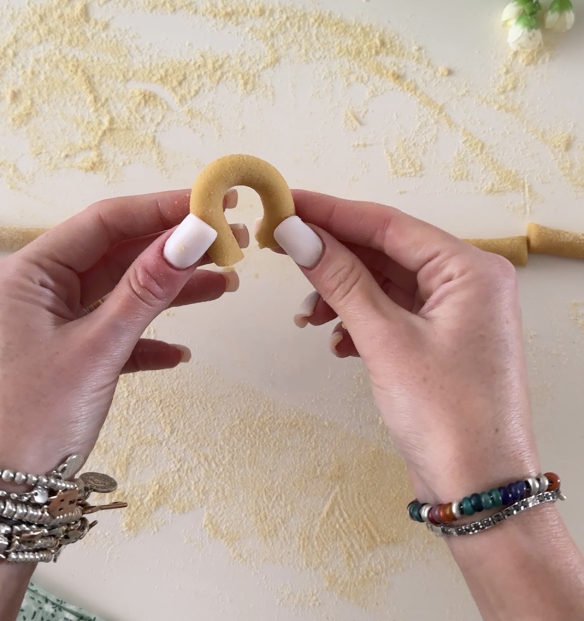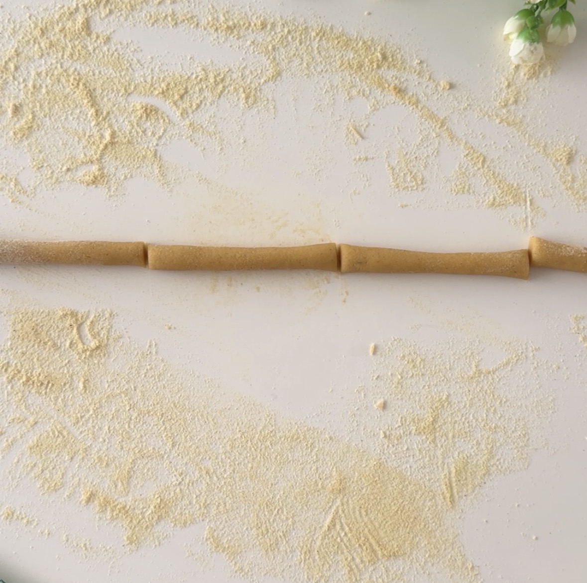 Trasferite l’impasto su un piano di lavoro cosparso con un velo di farina di ceci, formate un bel panetto, staccate dei pezzettini e formate dei cordoncini spessi circa un cm, tagliateli poi a pezzettini di circa 5/6 cm.