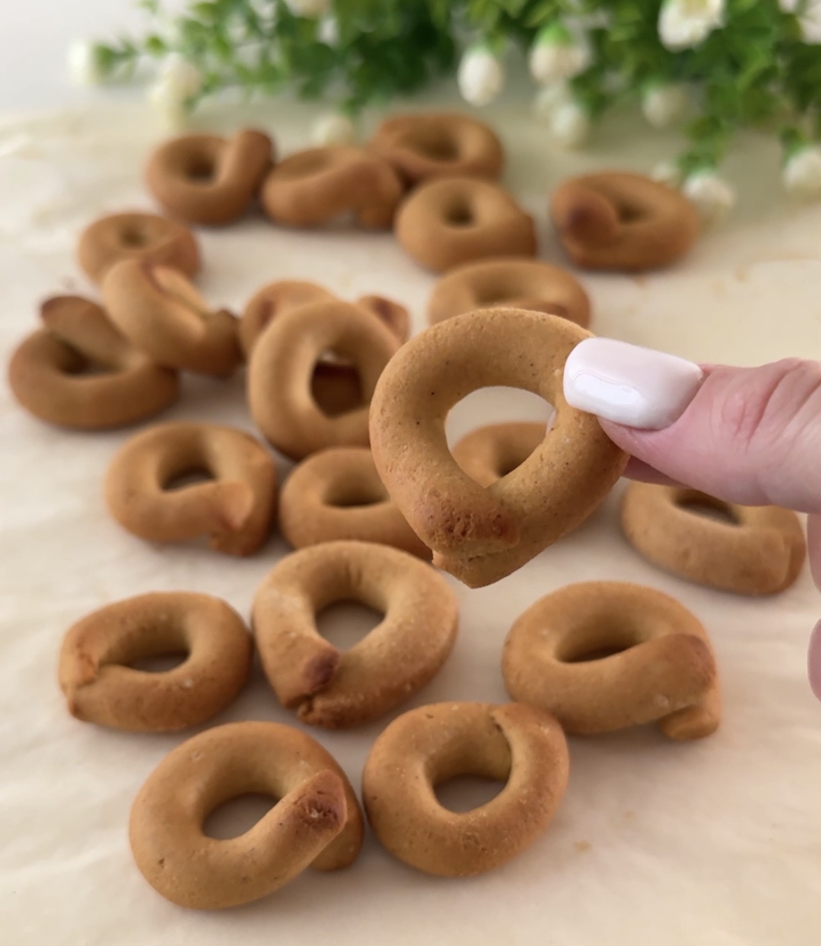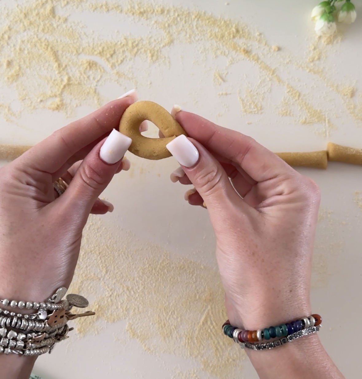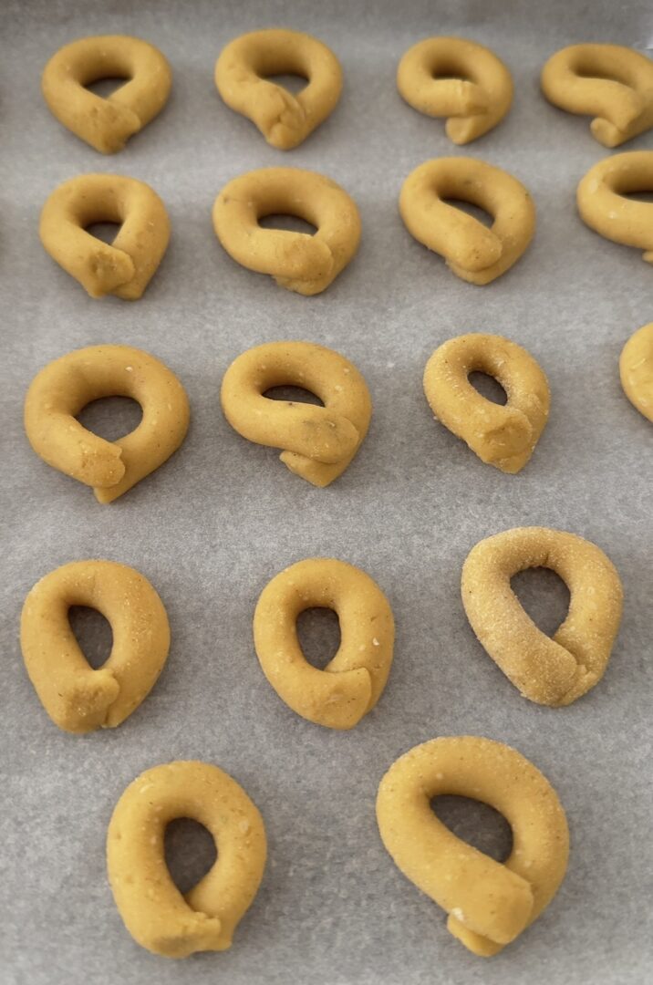 Avvicinate le estremità di ogni cordoncino e sovrapponetele, realizzate così tutti i taralli di ceci, sistemateli su una teglia foderata con carta forno e cuoceteli in forno preriscaldato a 180 gradi per 15/20 minuti, non prolungate troppo la cottura altrimenti si induriscono.