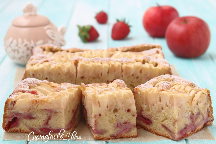 La torta mele e fragole è un dolce profumato e sofficissimo. Adoro le torte di mele e amo le fragole, quindi ho pensato di preparare questa torta buonissima che è andata proprio a ruba! La torta mele e fragole è morbida e ricca di frutta, senza burro, si scioglie in bocca, ottima a merenda e perfetta a colazione 😀