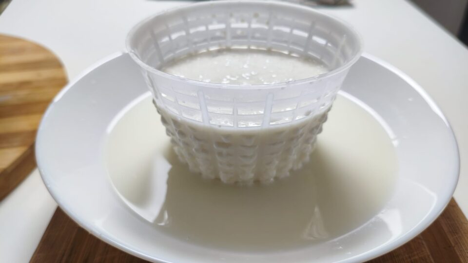 Trascorso questo tempo vedrai la cagliata con il siero, con un colino a maglie fitte raccoglila.