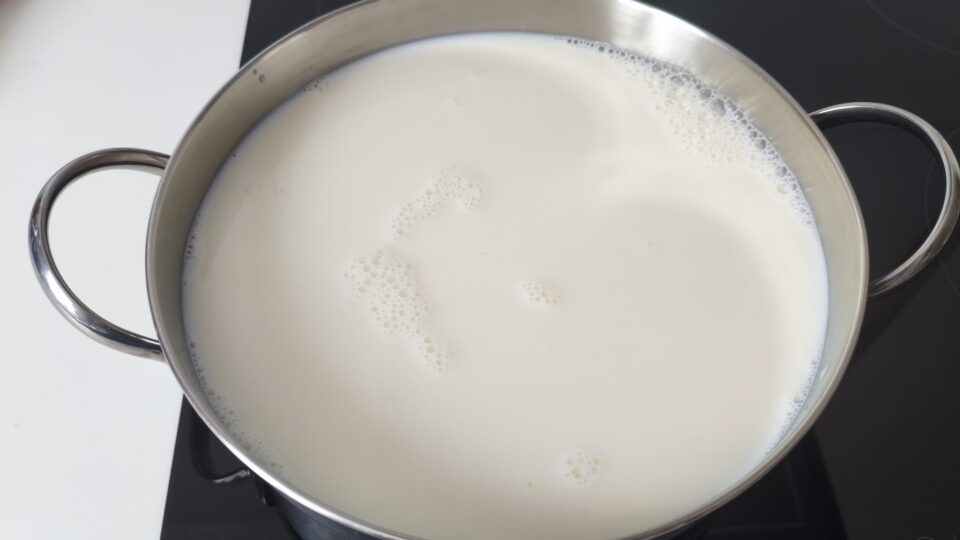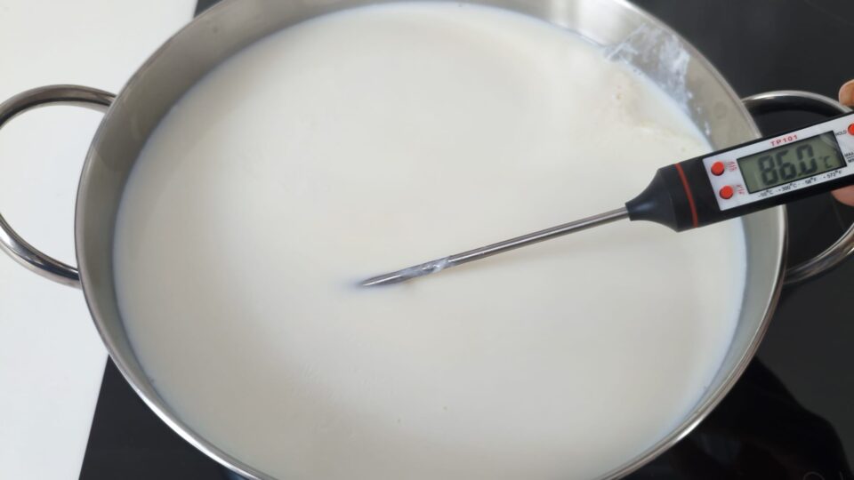 Versa il latte in una pentola capiente e scaldalo fino a 90°C, appena sotto il bollore. Mescola ogni tanto per evitare che si attacchi.