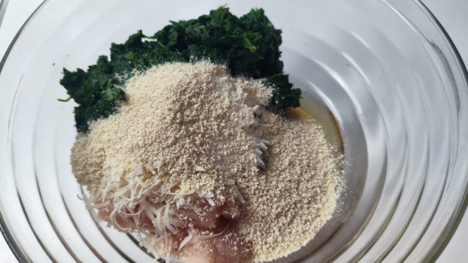 In una ciotola unisci pollo, spinaci, uovo, parmigiano, sale, pangrattato. Mescola fino a ottenere un composto modellabile.