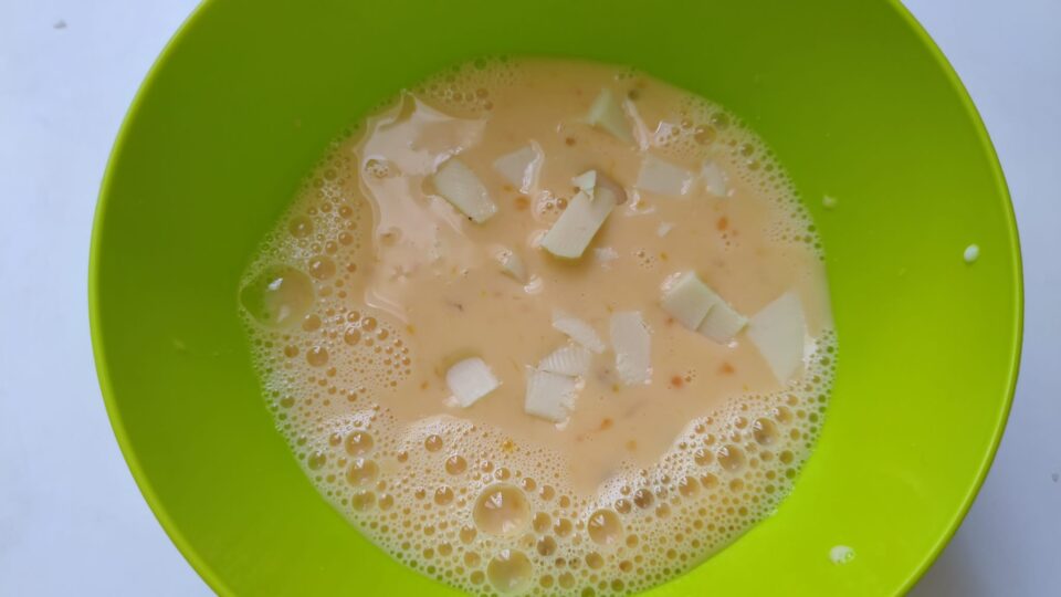 Sbatti le uova con il latte, aggiungi i dadini di emmenthal e un pizzico di sale. Versa il composto sopra le verdure, distribuendolo uniformemente.