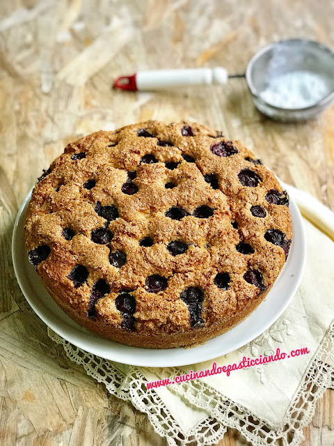 Versate l’impasto in una teglia da 24 cm di diametro imburrata e infarinata e disponete i mirtilli in superfice.Infornate a 180° per circa 45 minuti spolverizzando di zucchero di canna. Fate sempre la prova dello stecchino.