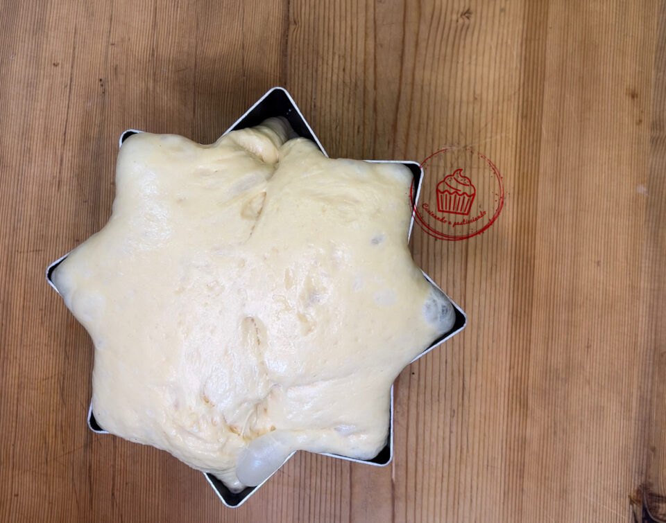 Quando l’impasto sarà lievitato, trasferitelo di nuovo sulla spianatoia leggermente imburrata, fate un’altro giro di pieghe e posizionatelo sullo stampo apposito per pandoro imburrato, coperto da pellicola, e fatelo lievitare fino a che non arriva al bordo.