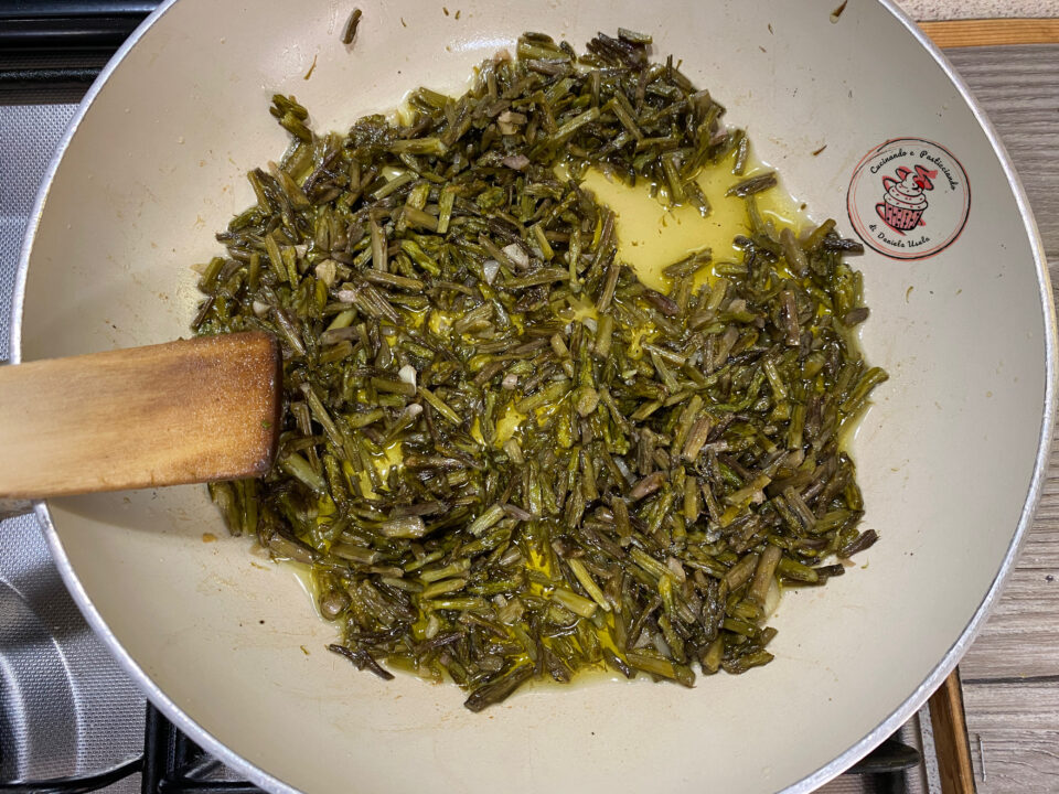 Li rosoliamo con olio e aglio tritato. Aggiustiamo di sale.