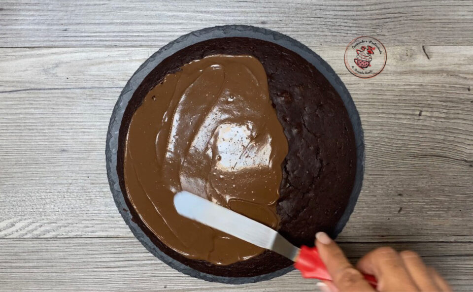 Far raffreddare la torta e farcirla in superficie con la crema alle nocciole.