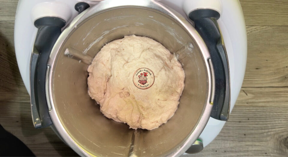 Aggiungi il sale e fai lavorare il bimby per 5 minuti a velocità spiga. Se occorre aggiungi un goccio d’acqua.