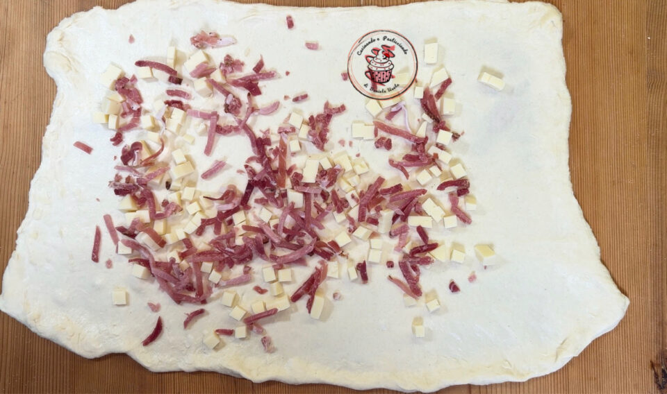 Apri di nuovo l’impasto come un lenzuolo e farciscilo con lo speck e la provola.