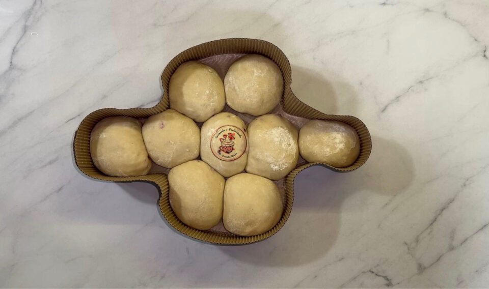 Posizioniamo le palline sulla stampo da colomba, copriamo e facciamo lievitare un’oretta.