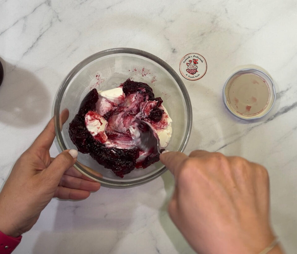 In una ciotola versiamo la ricotta e la marmellata e mescoliamo bene. Facciamo riposare in frigo.